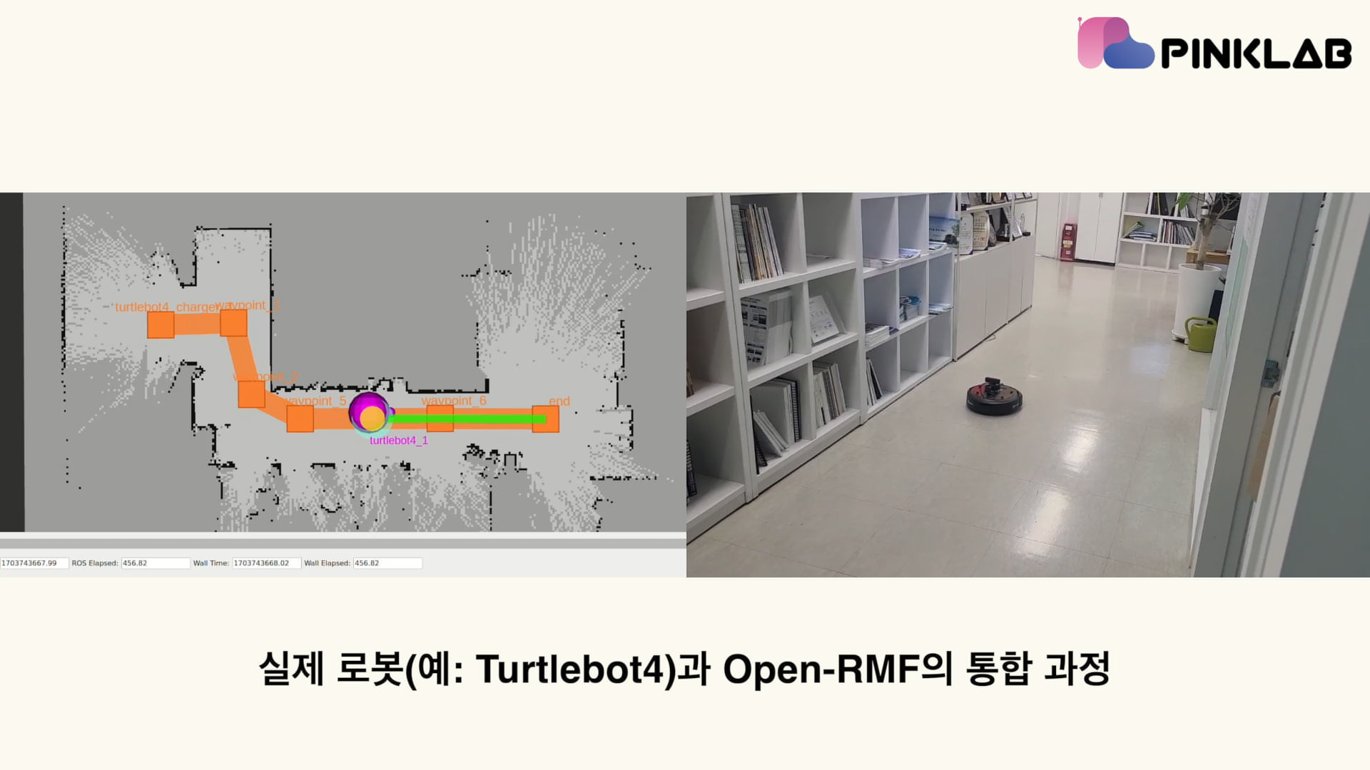 전체적인 부분은 아래 영상으로 한 번 자세히 보시기 바랍니다. 저희 핑크랩과 저는 OpenRMF 시뮬레이션, 실제 로봇과의 연결 등을 포함하는 교육 의뢰를 환영합니다. 더 나아가 OpenRMF를 이용한 관제 시스템 구축과 관련된 RND 개발 의뢰나 협업 또한 환영합니다.
