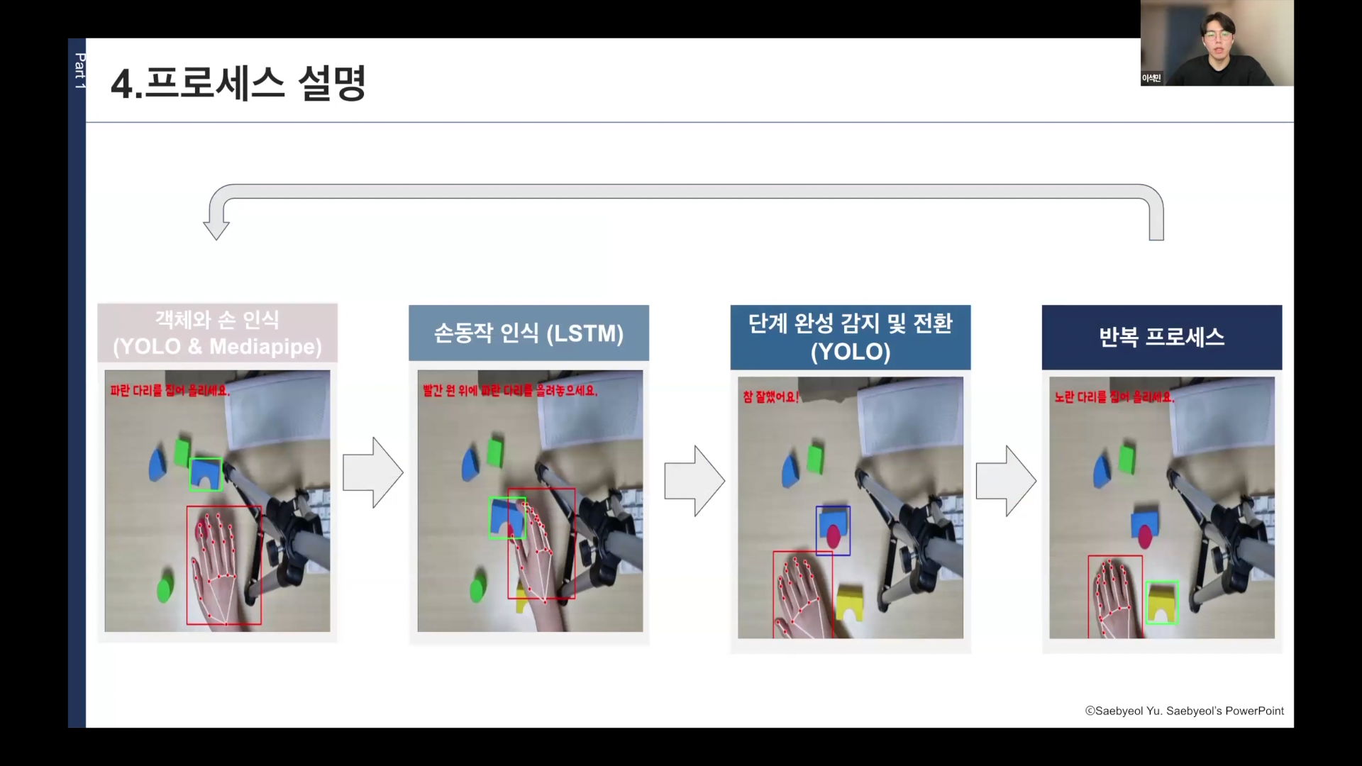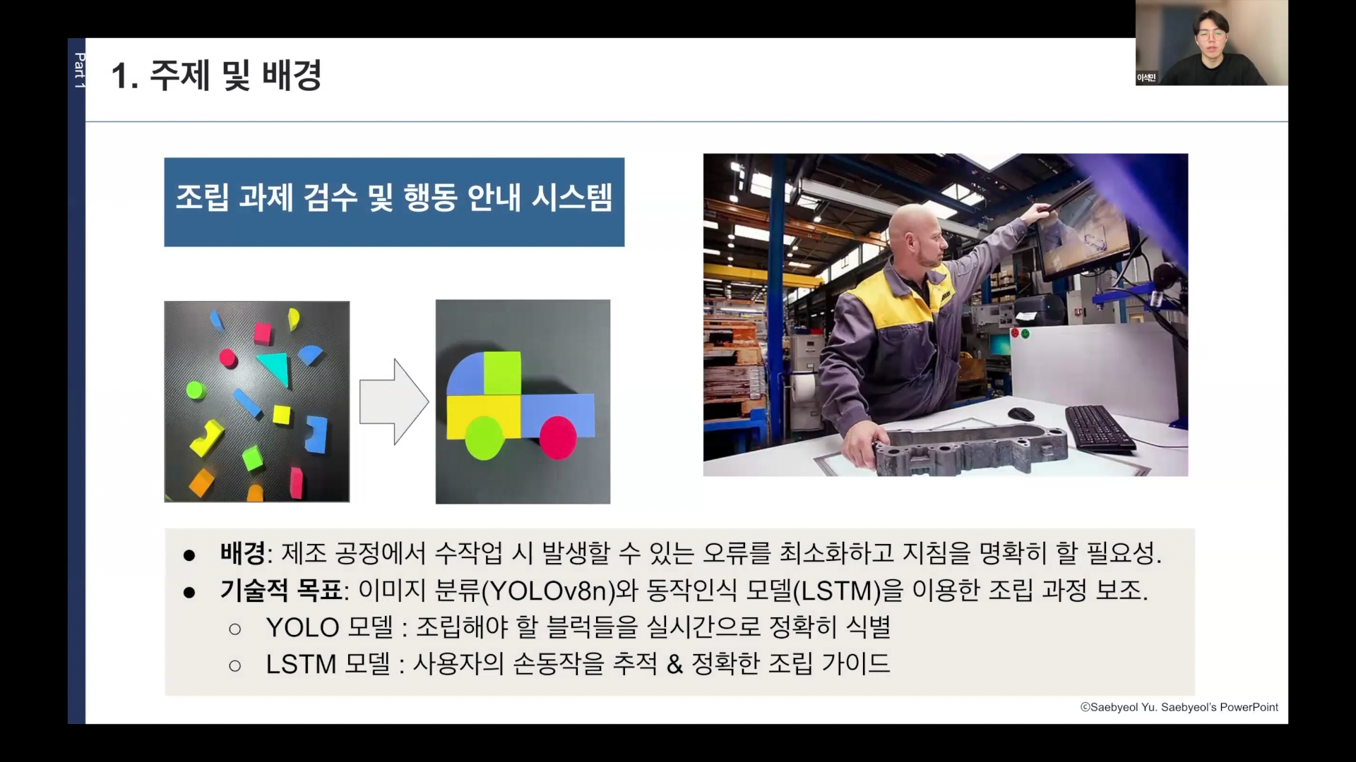 이 팀은 제조 공정에서 작업자의 작업을 가이드하는 컨셉을 구현하려는 노력에서 시작되었습니다. YOLO 모델과 LSTM을 사용했는데, YOLO는 작업자가 작업하는 대상 블록을 인식하는 것이고, LSTM은 행동을 인식하는 것에 촛점이 맞춰져 있습니다.