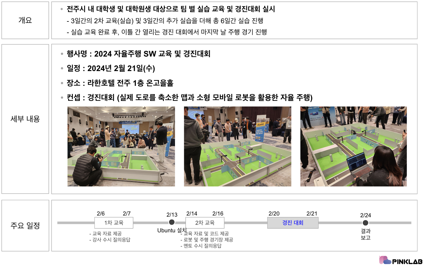 그리고 이번에 저희는 전북지역혁신플랫폼(RIS)의 일환으로 진행된 전북대학교의 미래수송기기사업단의 의뢰를 받아서 또 한 번 자율주행 SW 교육 및 경진대회를 진행했었습니다.