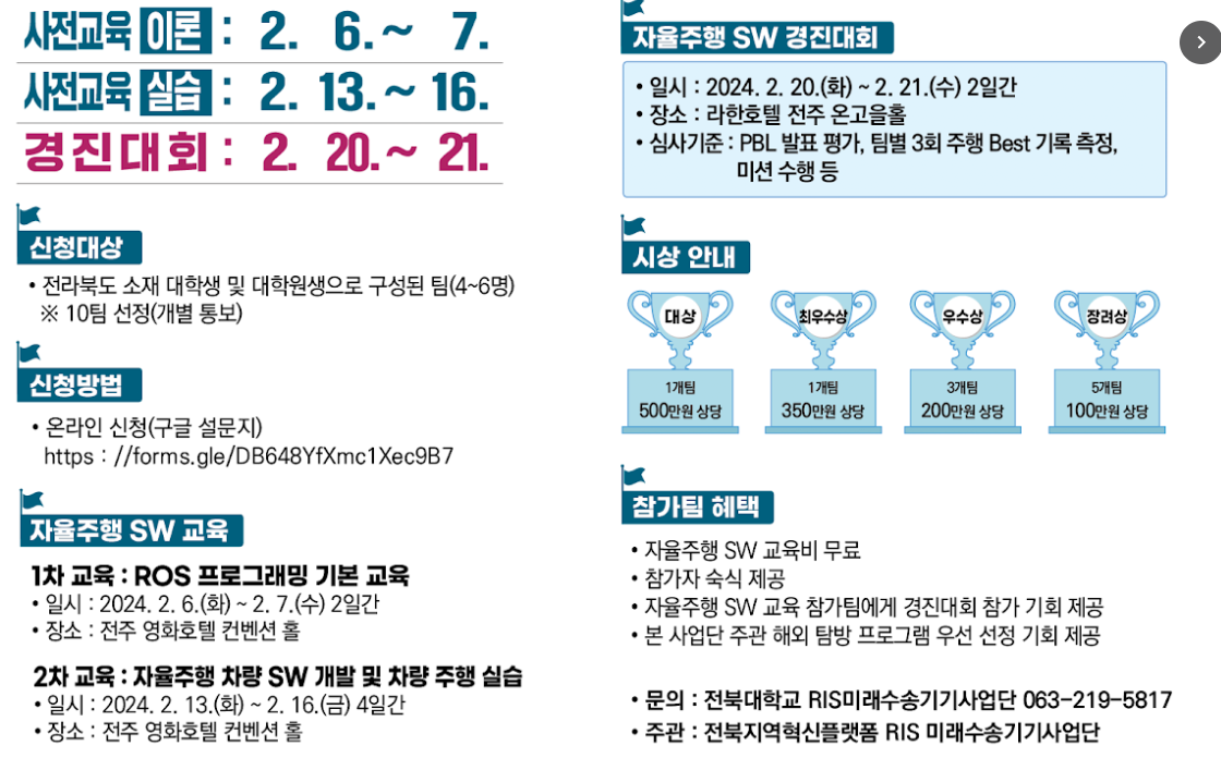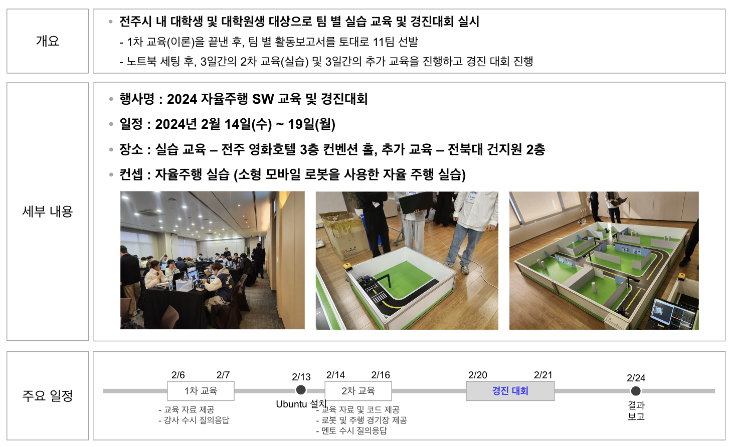 그리고 이번에 저희는 전북지역혁신플랫폼(RIS)의 일환으로 진행된 전북대학교의 미래수송기기사업단의 의뢰를 받아서 또 한 번 자율주행 SW 교육 및 경진대회를 진행했었습니다.