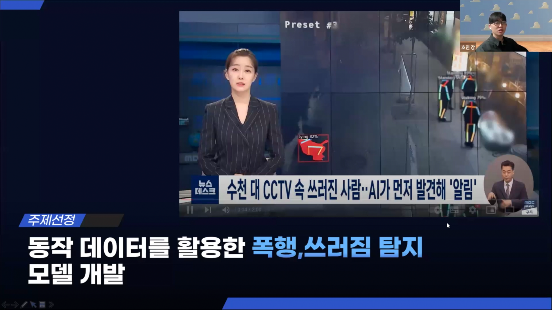 폭행이나, 쓰러짐을 한 장의 사진이 아니라 연속된 영상에서 파악하려는 것이 이번 프로젝트의 큰 목표이고, 폭행의 경우는 두 사람의 데이터를 동시에 탐지하는 것이 또한 목표입니다.