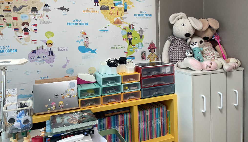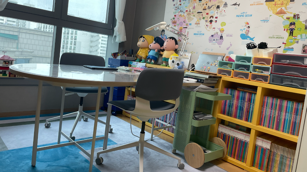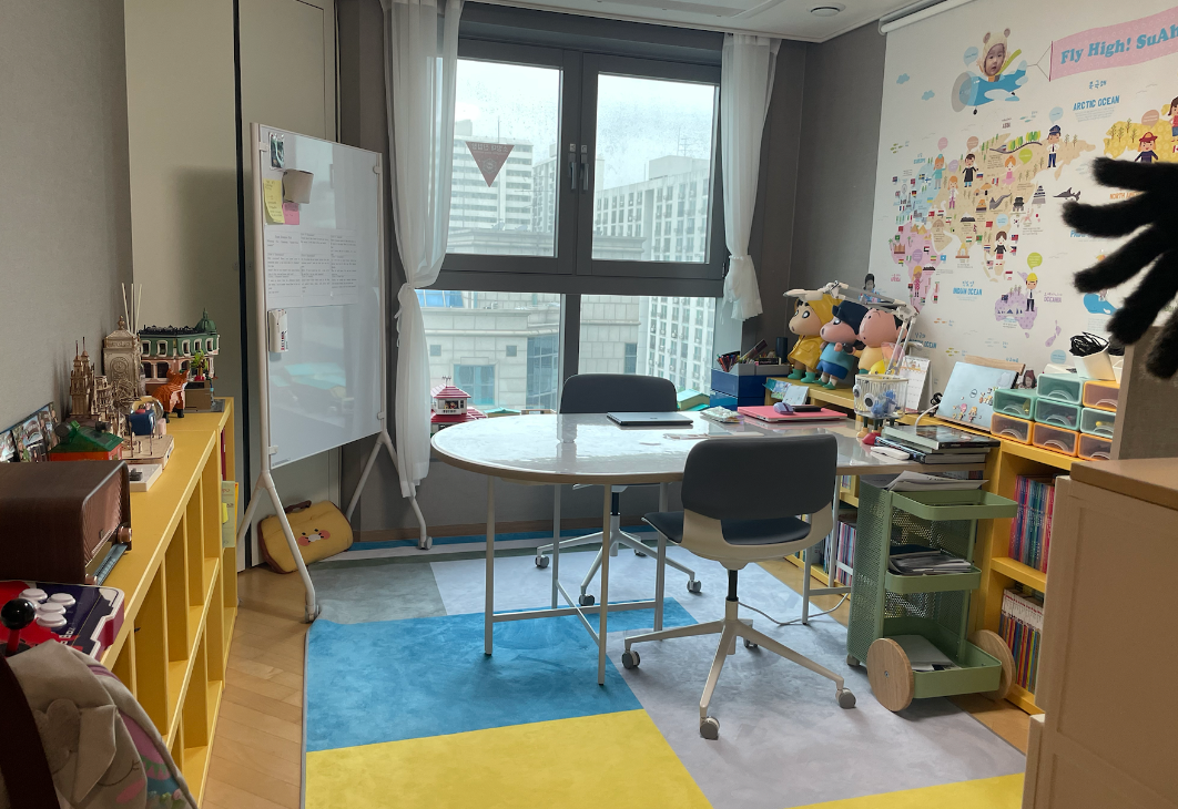 창밖에 보이는 저 건물은 놀랍게도 기술보증기금 건물입니다. 어릴때부터 자금 조달에 감을 익히라는 측면.. 킁~ 아무튼 뷰도 나쁘지 않고, 우리딸 최애 캐릭터인 짱구 일당도 있고, 테이블과 의자는 데스커로 세팅을 했습니다.^^