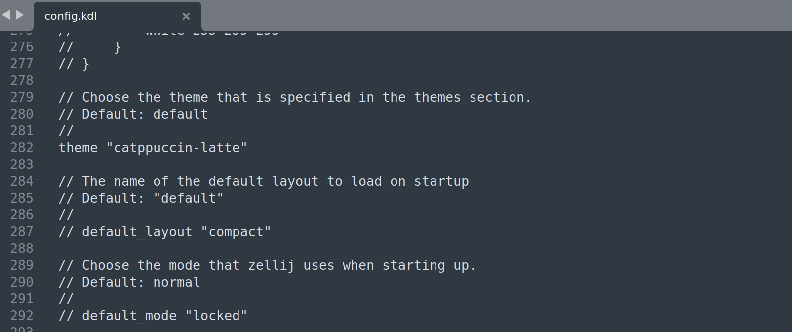 편집기로 그 파일을 열어서 위에 보이는 theme이라는부분을 찾아서 주석(//)을 해제하고 원하는 테마를 넣습니다. 이제 터미널을 열고 zellij라는 명령만 주어도 테마가 적용됩니다. 그리고, 터미널을 실행할 때마다 zellij를 실행하고 하고 싶다면, ~/.zshrc 파일에