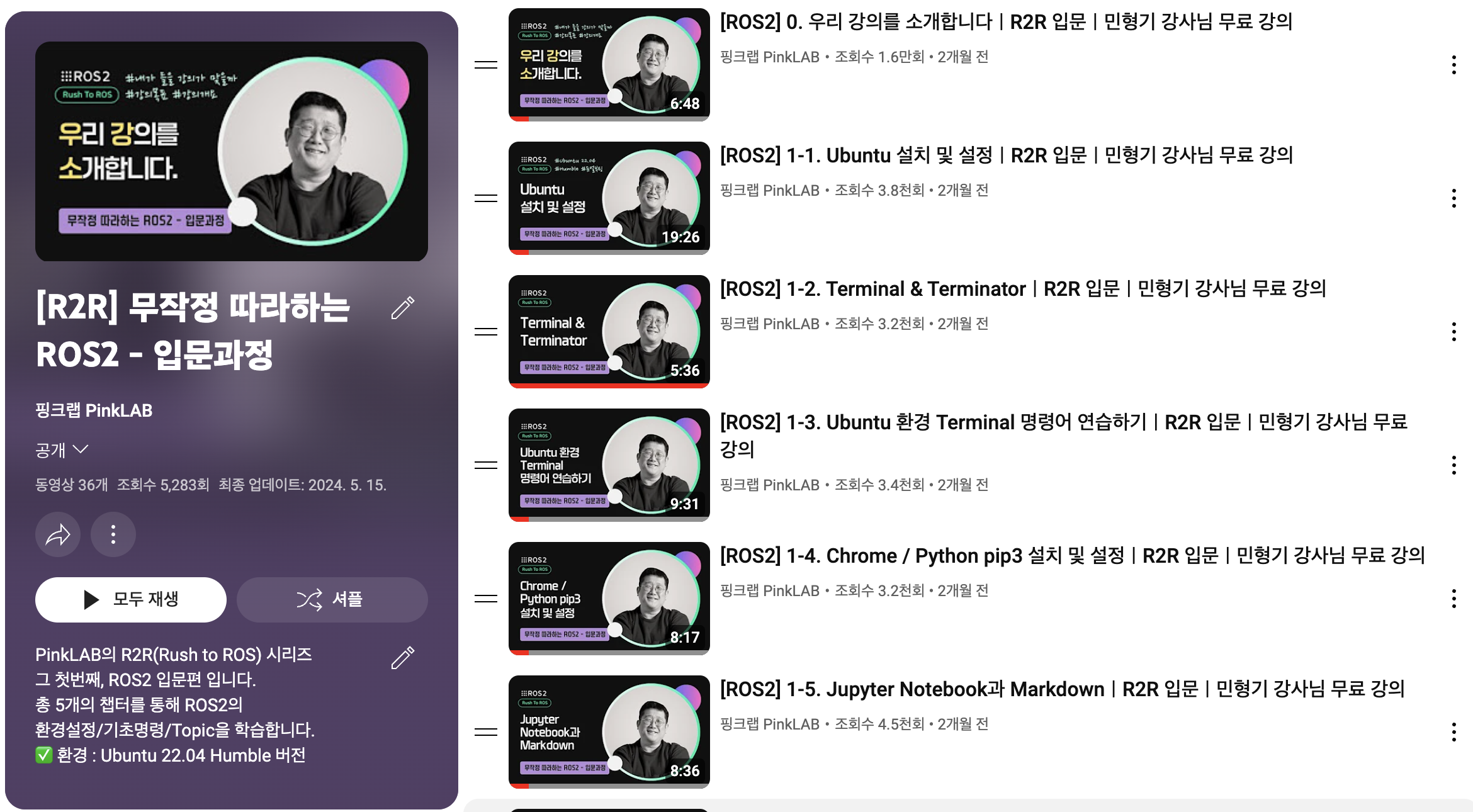 PinkLAB의 R2R(Rush to ROS) 시리즈 그 첫번째, ROS2 입문편 입니다. 총 5개의 챕터를 통해 ROS2의 환경설정/기초명령/Topic을 학습합니다. ✅ 환경 : Ubuntu 22.04 Humble 버전 💛 강의 업로드 ➡️ 월/수/금 💛