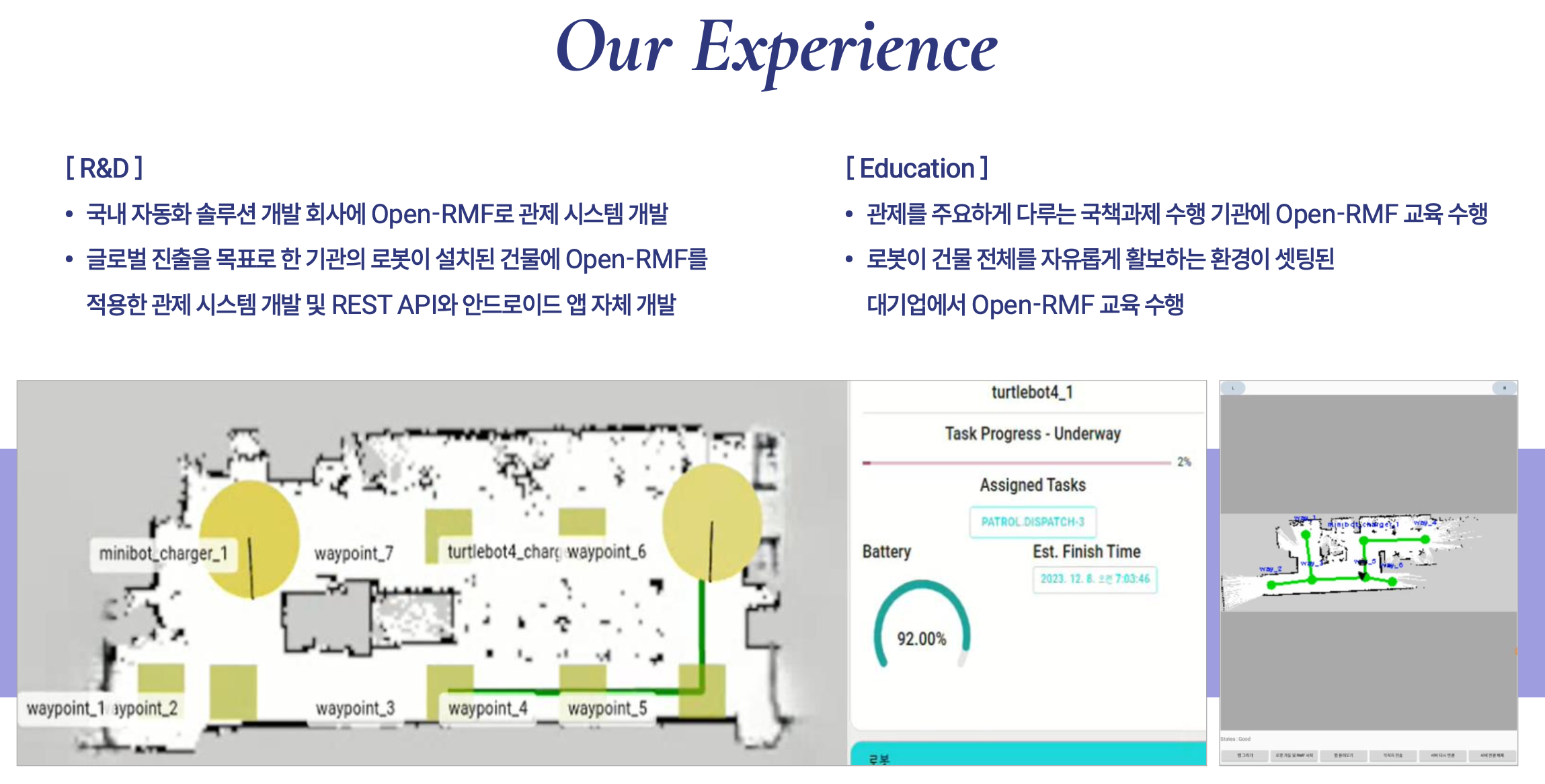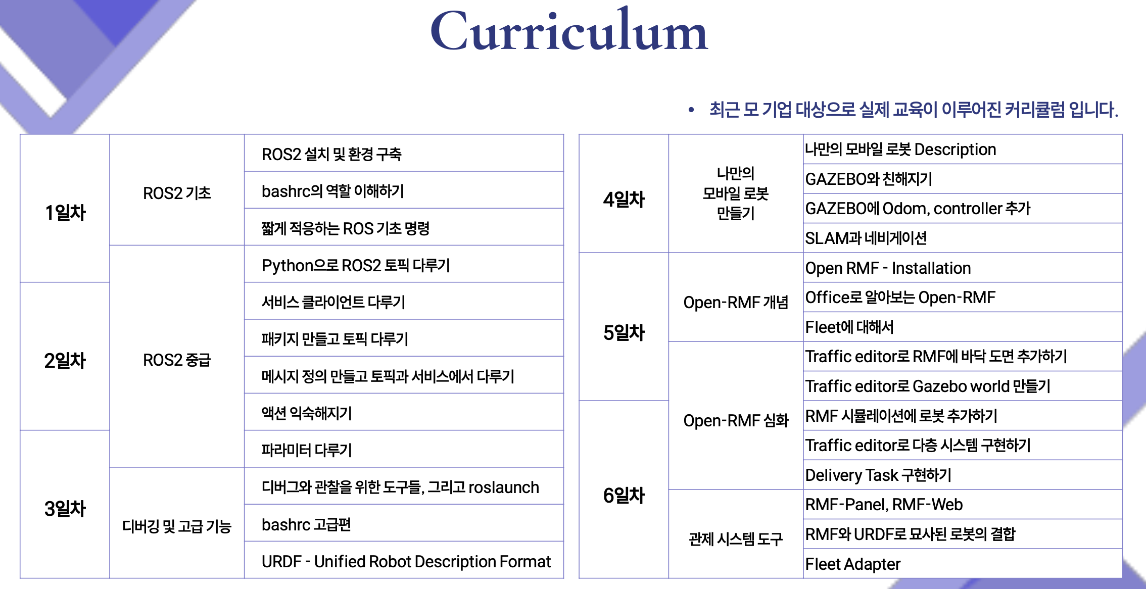 총 6일정도라면 ROS2 기초부터 시뮬레이션 상에서 OpenRMF를 충분히 진행할 수 있습니다. 만약 실제 로봇과 붙이는 작업도 교육으로 가능합니다. 아래 글과 그 글 속의 영상도 한 번 확인해주세요