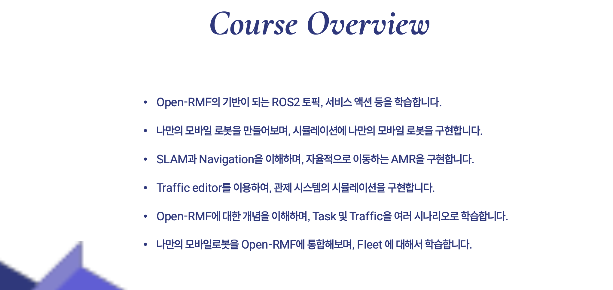 최근들어서 저와 저희 핑크랩이 OpenRMF관련 교육이야기를 많이 했습니다. 이번에 OpenRMF 관련 교육 커리큘럼을 정해보았습니다. 저희가 회사가 생긴지가 만 2년하고 한달이 지나가고 있는데, 벌써 OpenRMF 관련해서만 기업 프로젝트 2회 완료, 교육만 3회 진행을 했네요. 그 경험을 녹여보았습니다.
