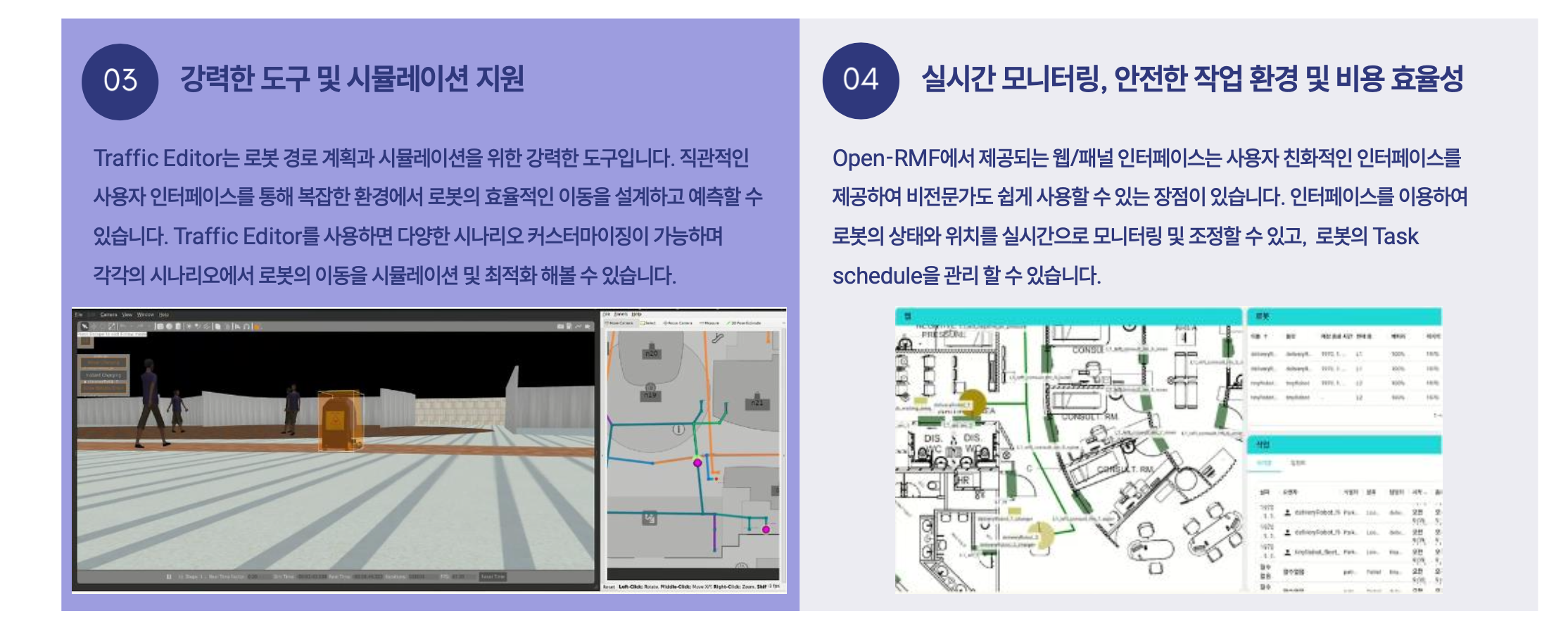 OpenRMF를 통해서 로봇 통합 관리를 손쉽게 할 수 있습니다. 여러가지 확장성도 확보할 수 있구요.