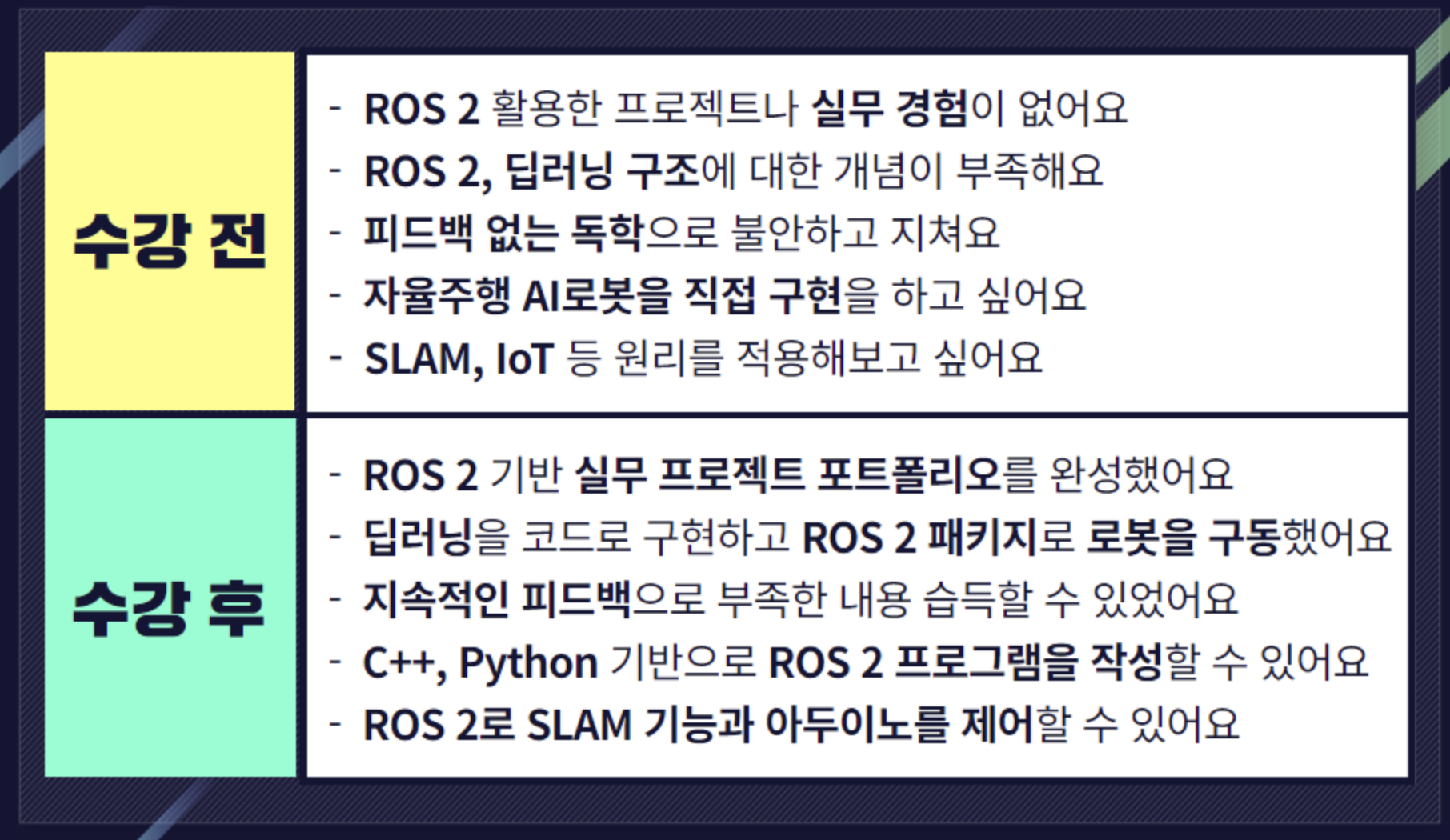 딱 44일간의 기간, 알찬 관리와 알찬 장비로 수강생들의 성장을 기대할 수 있는 좋은 과정을 런칭하게 된것 같아 너무 좋네요^^ 과정에 대한 안내는 아래 링크에 있습니다.