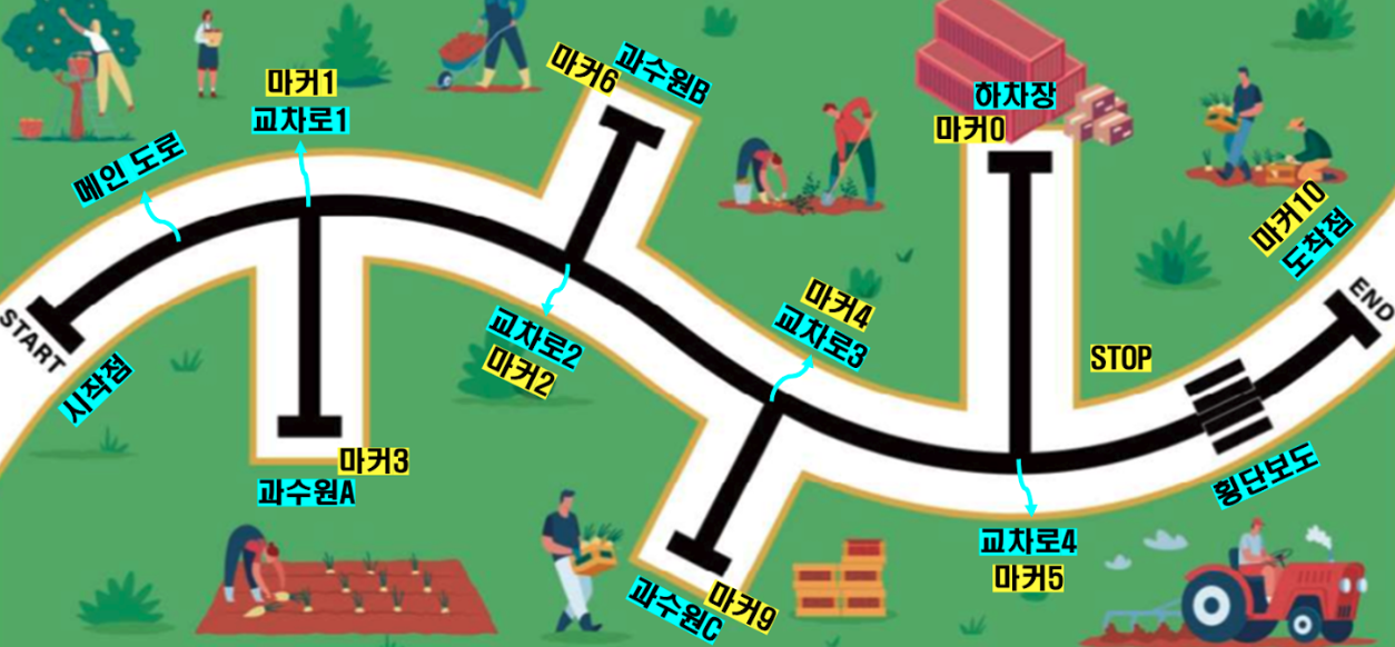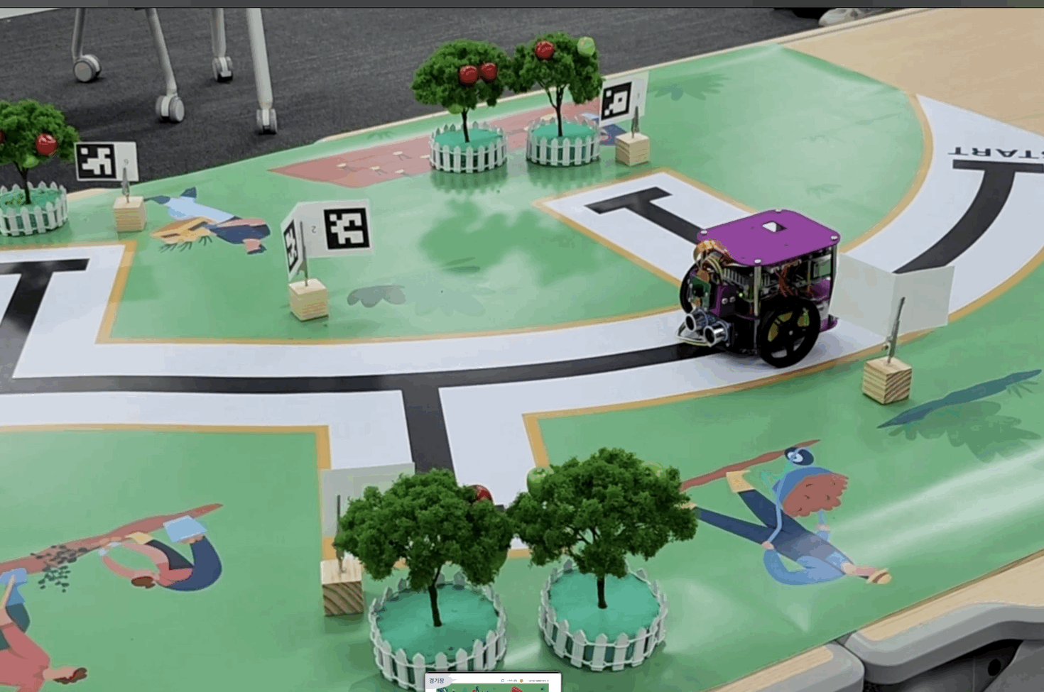 위 영상의 팀은 교차로에 표시된 아루코마커를 보고 교차로인지를 인식하고 과수원(^^)으로 진입하는 장면입니다.