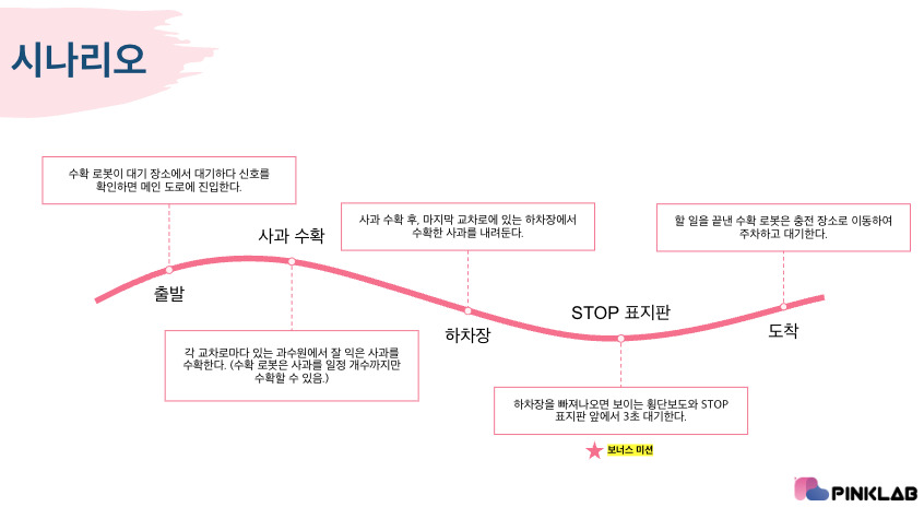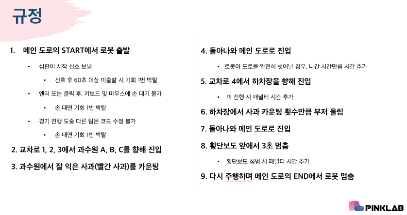 저렇게 특정 장소에 와서 빨간 사과가 총 몇개인지를 알려주고 돌아갑니다. 사과 갯수를 알려주는 방법은 본인들 노트북에서 프린트되는 것을 심판이 보거나, 부저로 갯수만큼 삑~ 거리면 됩니다. 그리고 돌아갈때는 또 횡단보도에서 멈추었다가 돌아가야 하는거죠.