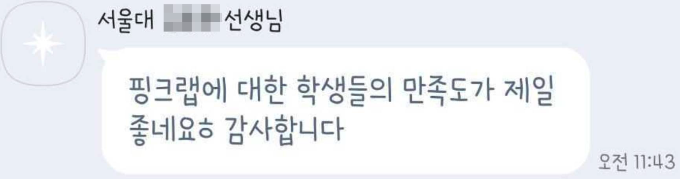 그리고, 여러기관에서 여러 교육을 이번에 했는데, 저희 핑크랩에 대한 참여자들의 만족도가 가장 높았다는 피드백을 담당하시는 분께 듣고서, 모든 피로가 또 사라지는 마법에 취했습니다.^^