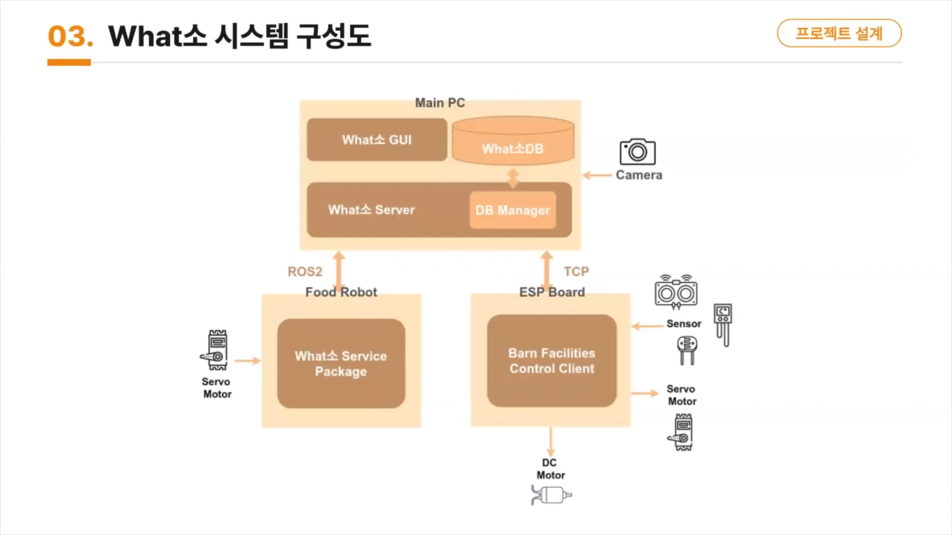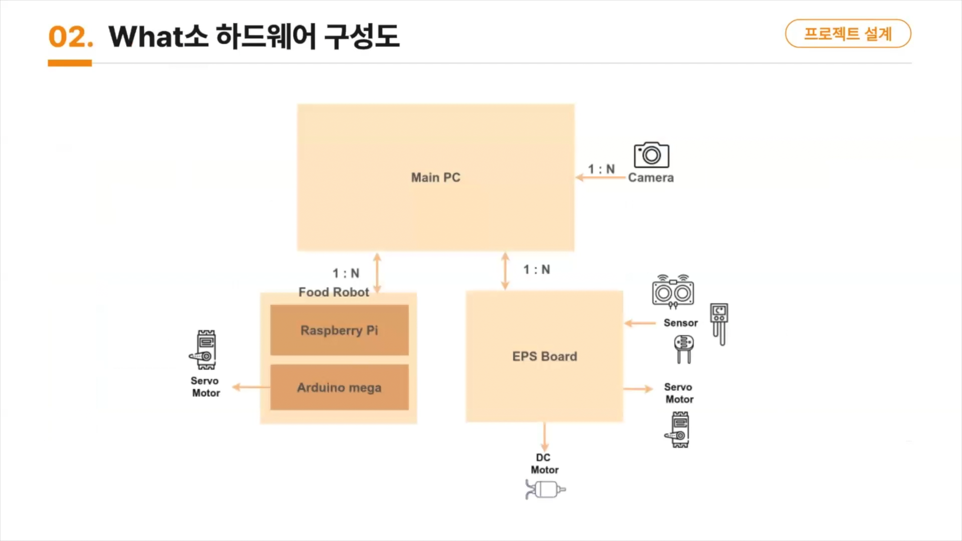 ESP 보드와 다수의 서보모터 및 메인 PC와 로봇등을 활용하여 전체 시스템을 고민했습니다.