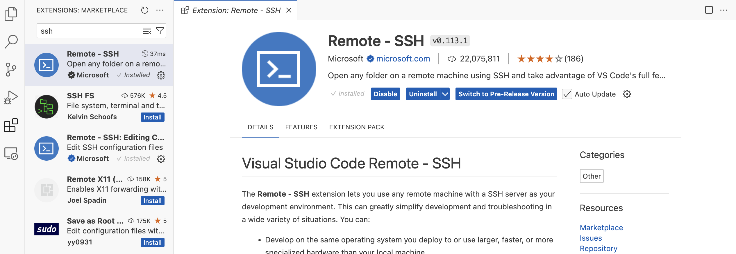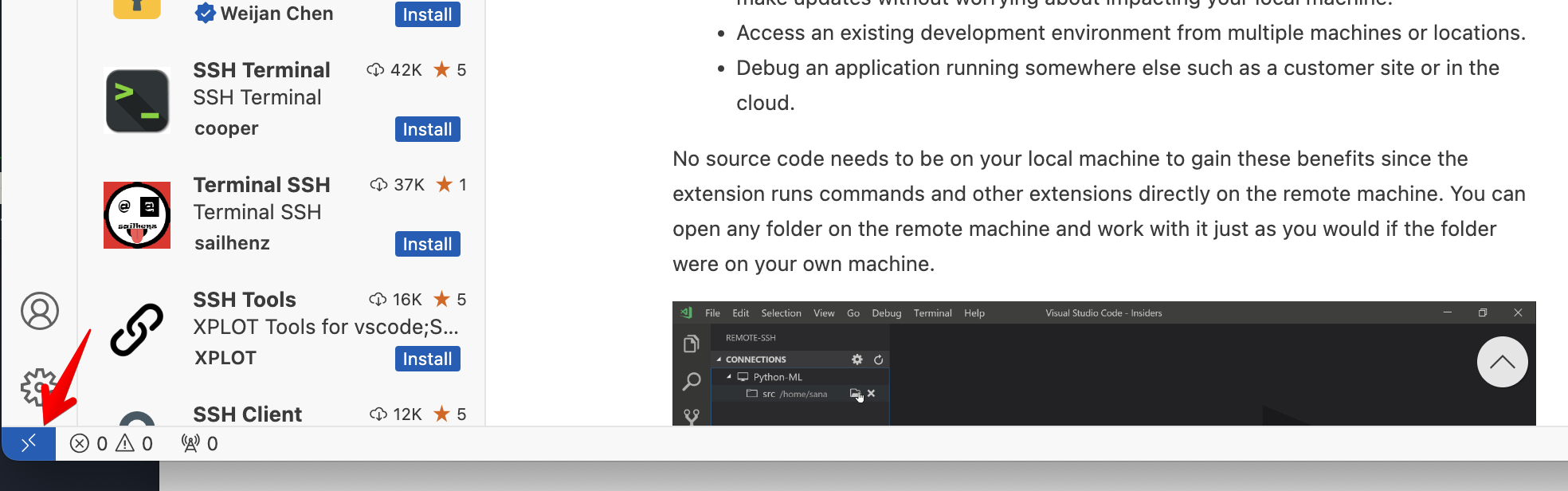 이제 나의 PC[제 경우는 맥]에서 VSCode를 실행합니다. 그리고 ssh extention을 설치합니다.