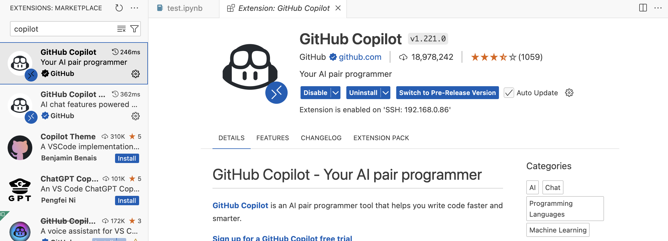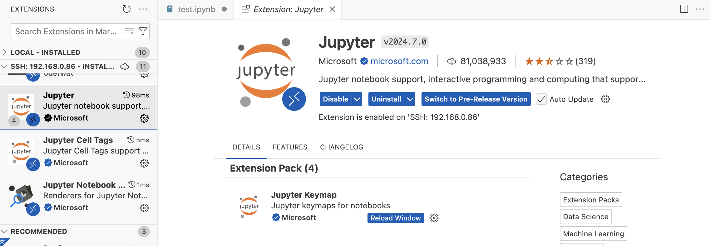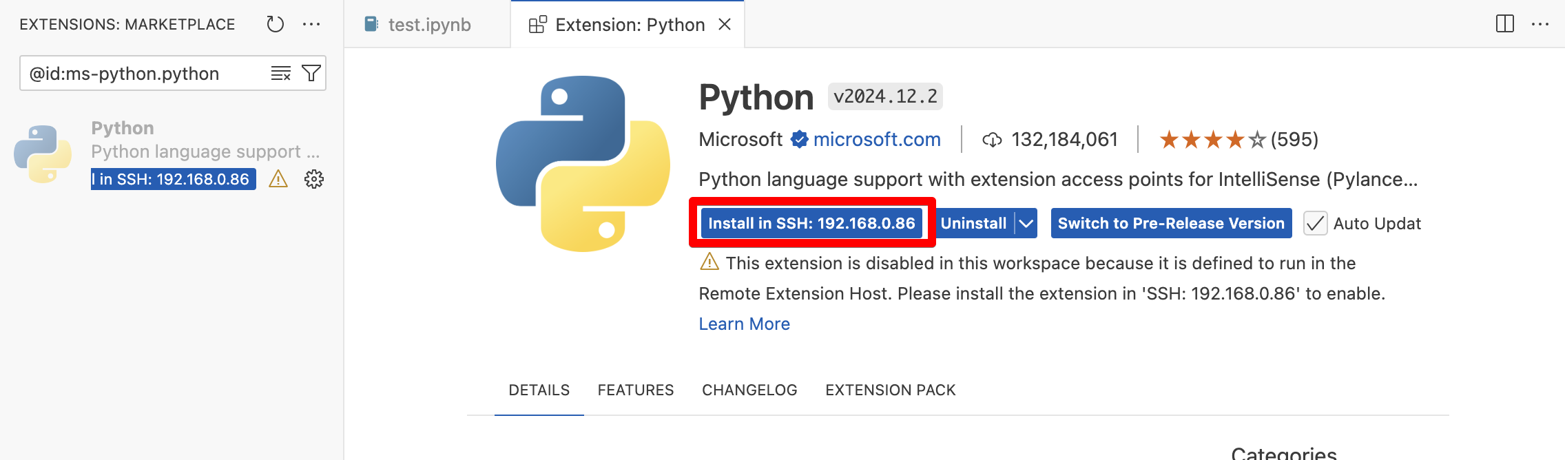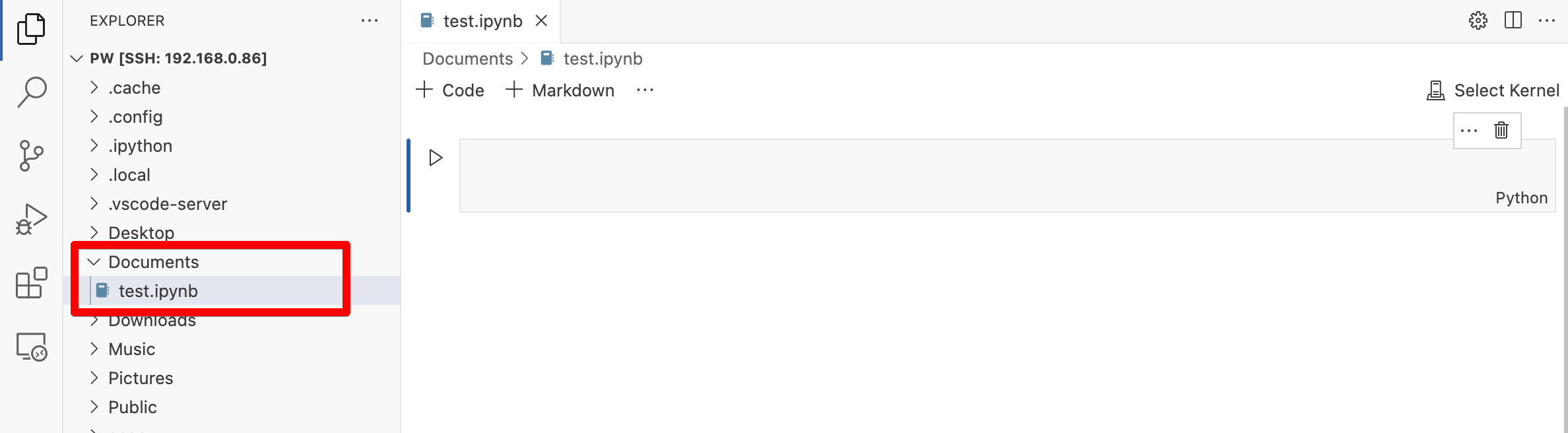 그리고 Python을 설치합니다. 여기서 주의할게 나의 로컬 PC가 아니라 ssh로 연결된 원격지에 설치한다는 것입니다. 위 그림에서 빨간 박스에서 SSH가 보여야 합니다.