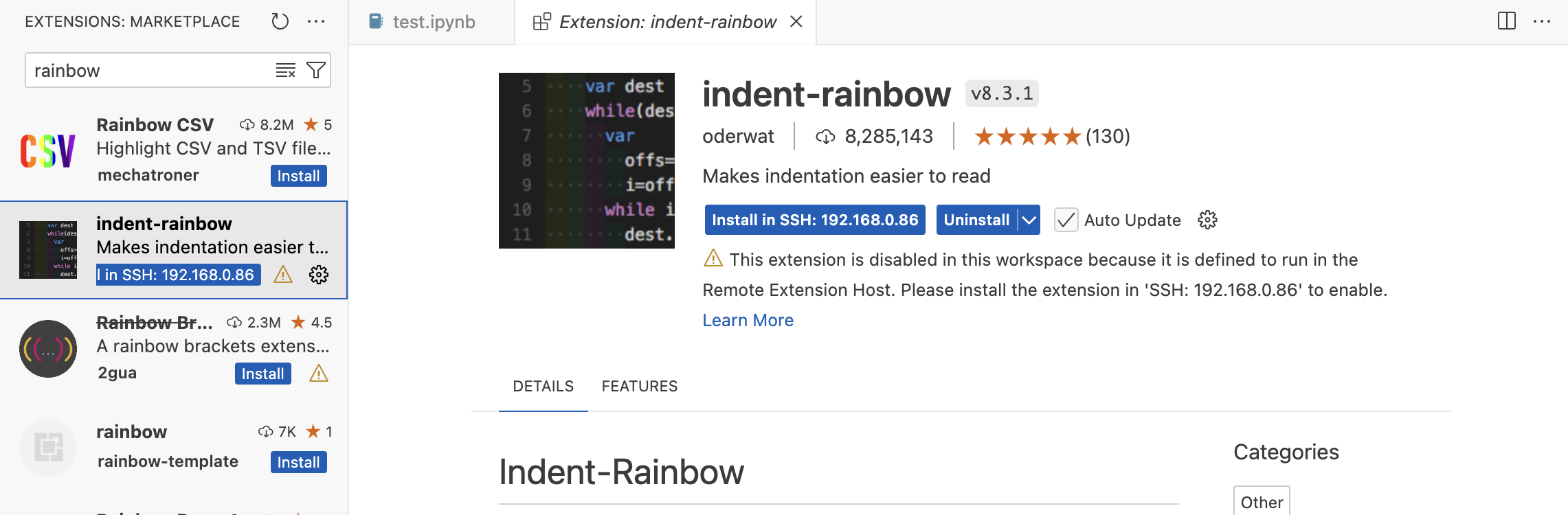 그리고 indent-rainbow도 살짝 추천합니다. SSH에 설치하세요~