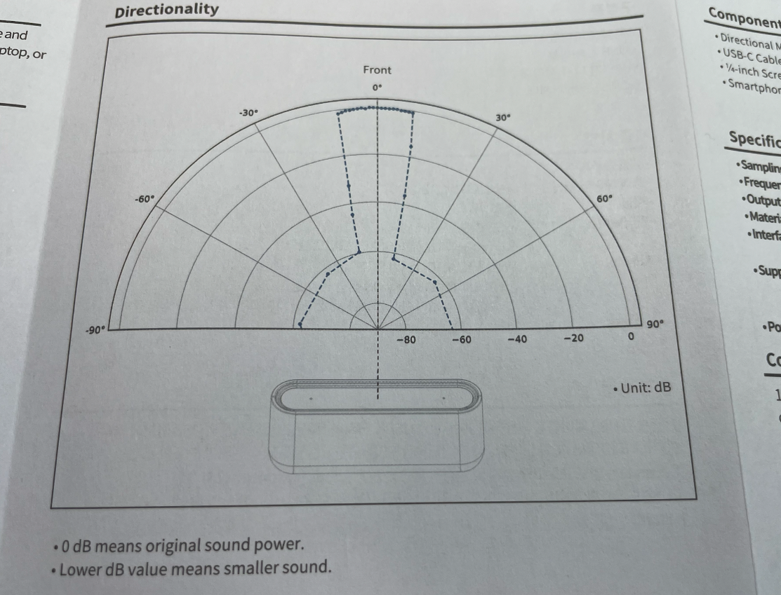 사실 이 제품은 저 그림으로 모든것을 설명합니다. 아름답지 않나요? 저기서 0dB는 소리를 그대로 전달한다는 겁니다. 번역하면 "저 제품은 정면에 있는 소리만 전달"한다는 거죠. 와우~