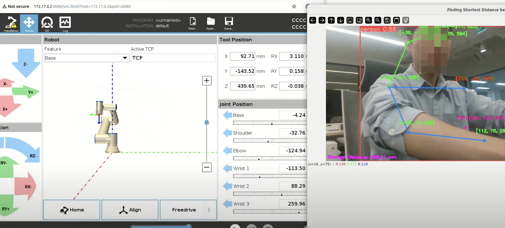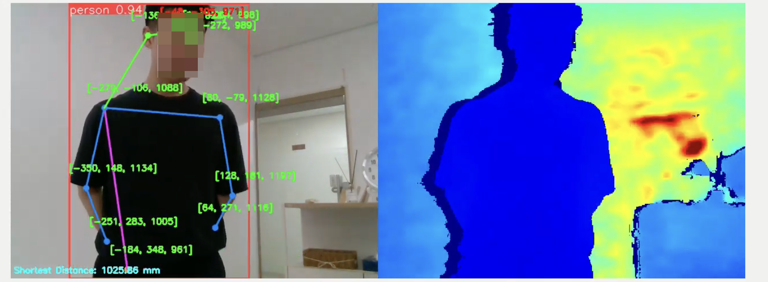 우리는 XYZ에서 제시한 미션 중 인턴쉽 수준에서 할 수 있는 두 달 정도 규모로 내용을 잡고, 핑크랩의 선임연구원이 관리자로 작업 진행을 관리했습니다. 미션은 뎁스카메라로 로봇팔과 충돌이 사람이 날것 같으면 그것을 감지하는 내용입니다. 3D 카메라를 사용해서 사람의 거리를 잡고, 현재 로봇팔의 각 조인트의 위치를 잡아서 충돌을 체크하는 것인데, 카메라 장착 위치에 맞춰서 좌표를 잘 계산하면서 진행을 해야하겠죠. 그 과정에서 예상치 못한 여러 어려움들이 또 존재했지만, 우리 인턴 지원자는 잘 극복하고, 지금 XYZ에서 7월 1일부터 잘 생활하고 있답니다.^^