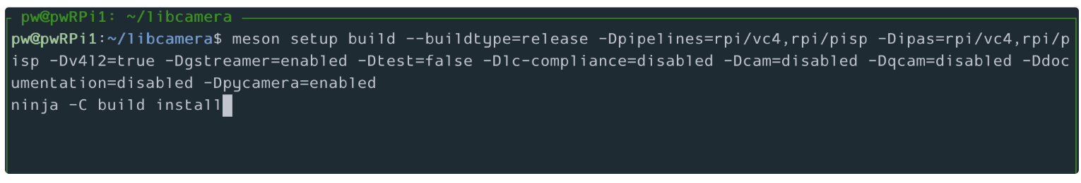 meson setup build --buildtype=release -Dpipelines=rpi/vc4,rpi/pisp -Dipas=rpi/vc4,rpi/pisp -Dv4l2=true -Dgstreamer=enabled -Dtest=false -Dlc-compliance=disabled -Dcam=disabled -Dqcam=disabled -Ddocumentation=disabled -Dpycamera=enabled