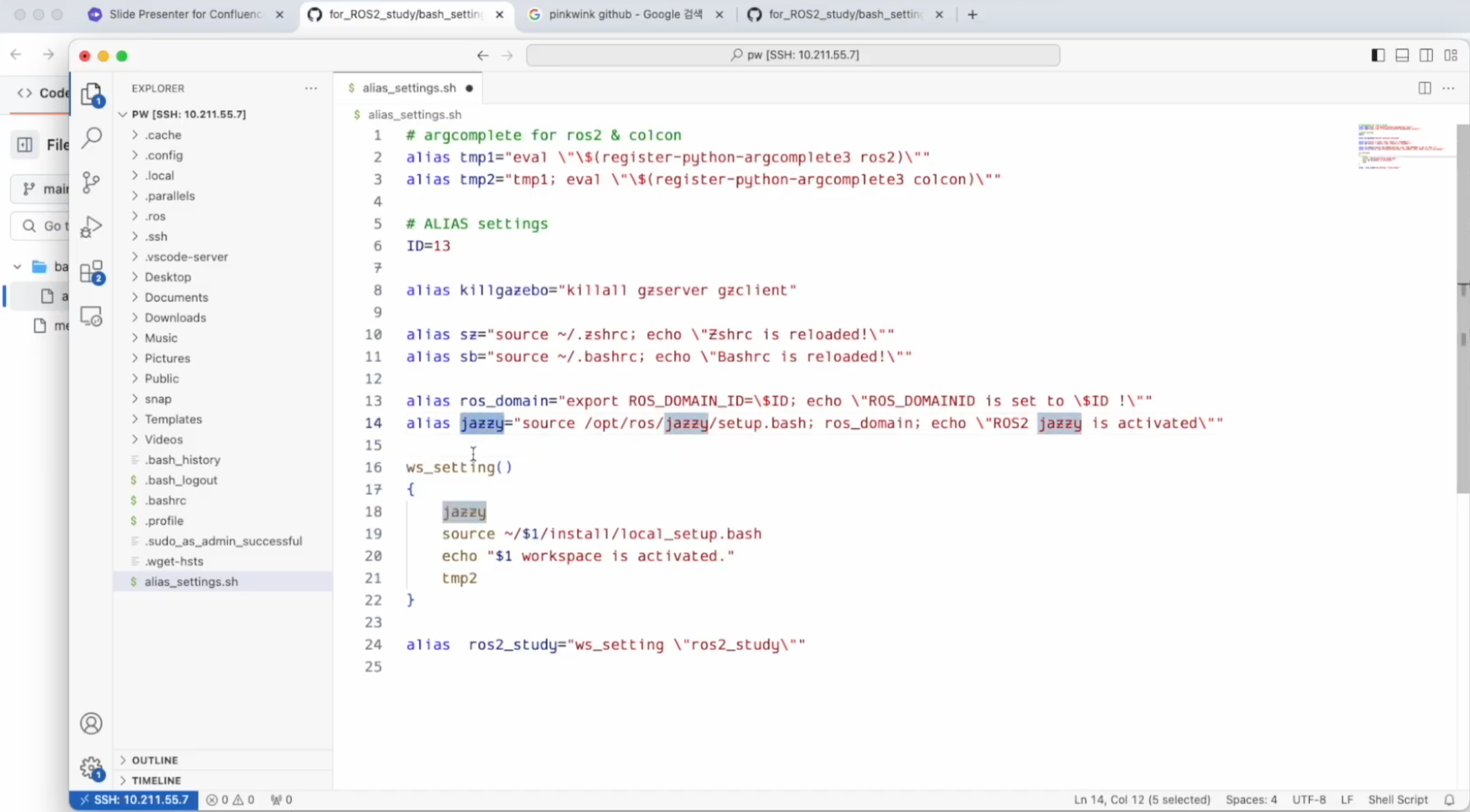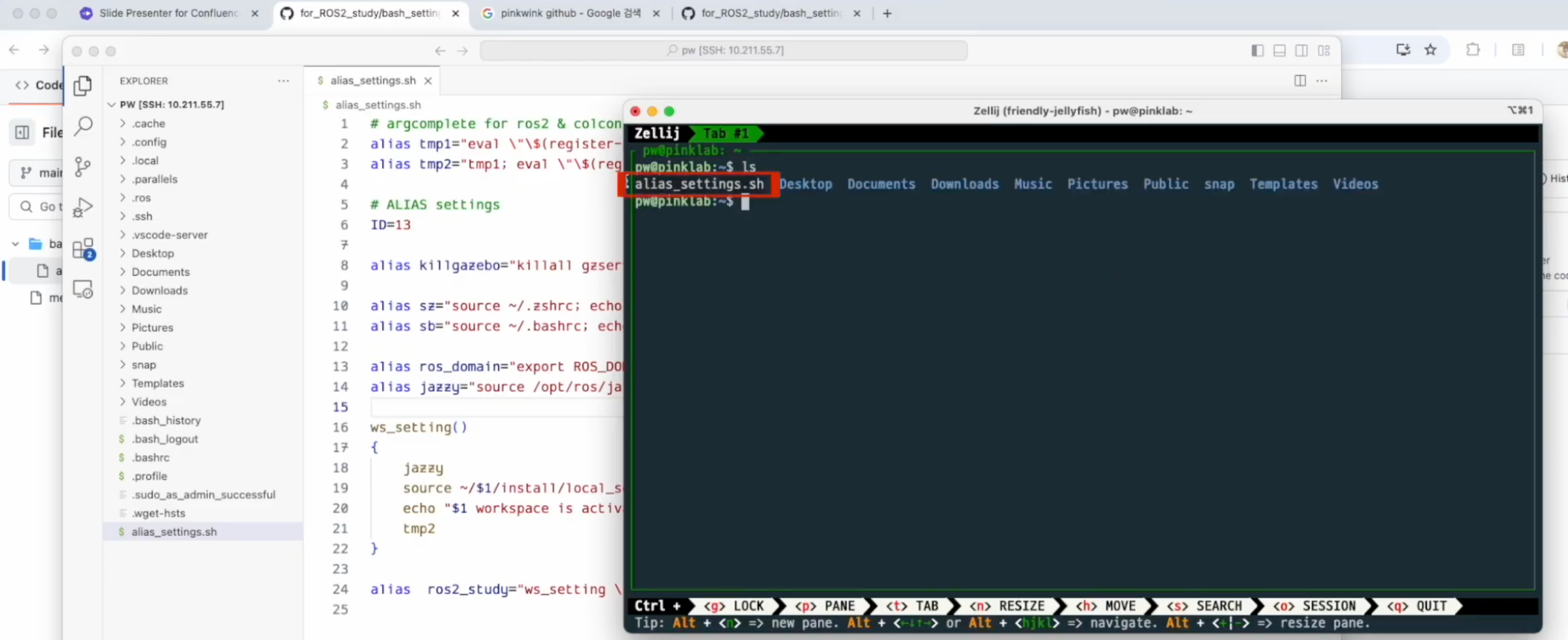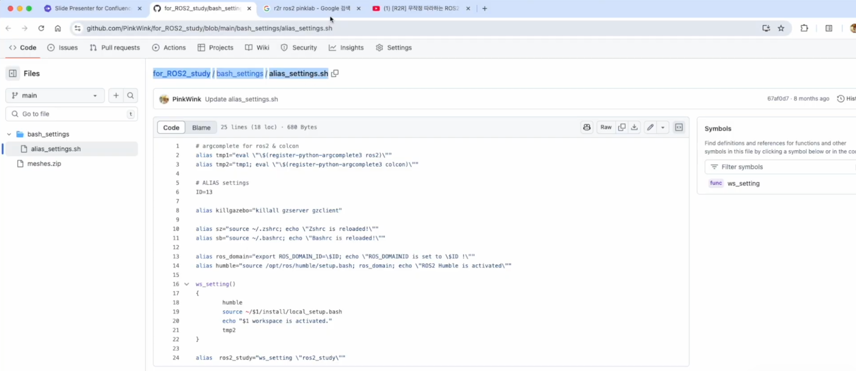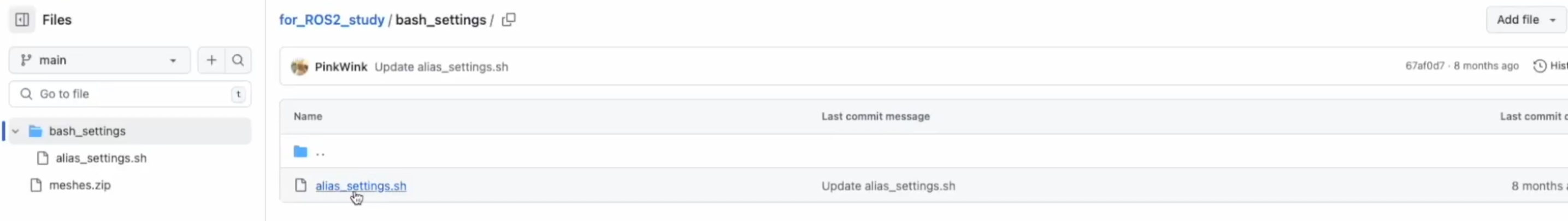PinkWink Github - Repositories - for_ROS2_study 를 찾으시면 됩니다. bash_settings - alias_settings.sh 이 파일이 있어요.