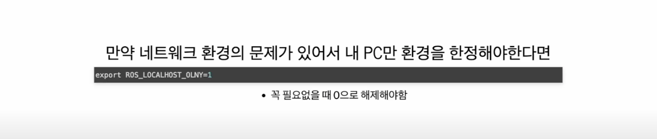 네트워크 문제가 있어서 내 pc에서 topic이 밖으로 안 나가게 해야한다, 그러면 ROS_LOCALHOST_ONLY=1로 설정 해야하구요, 이것도 bashrc나 alias_settings.sh에 넣어주면 됩니다.