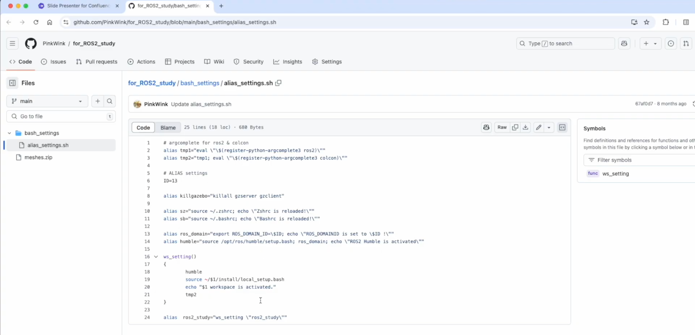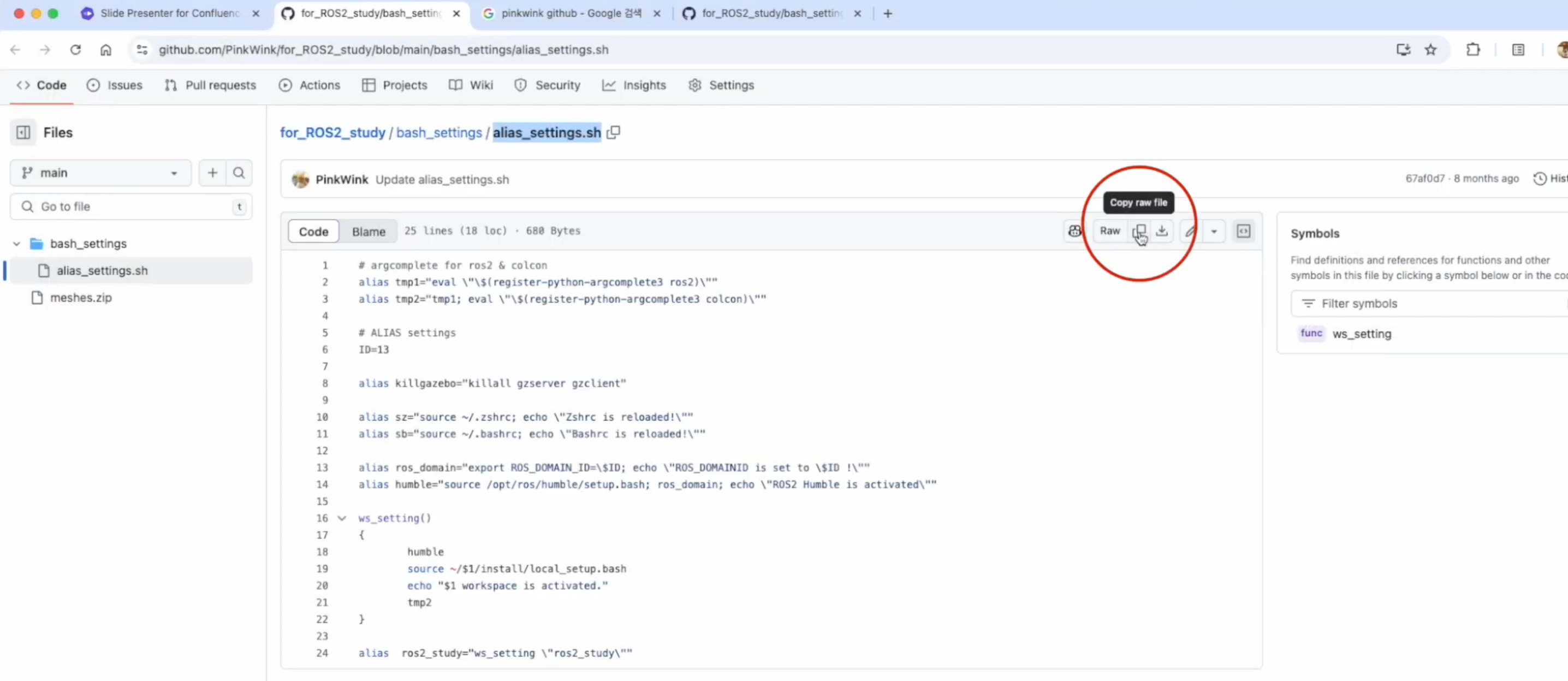 그리고 그 내용은 이렇습니다. 강사님이 타이핑하시기 어려울 것 같다고 깃허브에 넣어주셨어요. https://github.com/PinkWink/for_ROS2_study/blob/main/bash_settings/alias_settings.sh