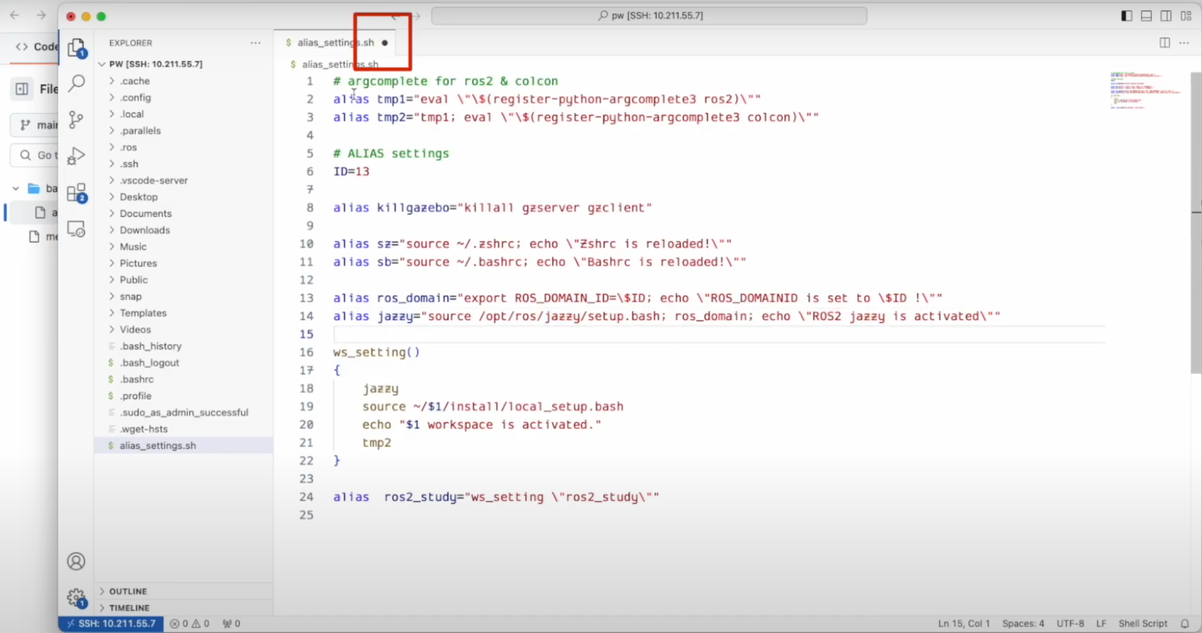 vscode 에서 명령어로 source ~/alias_settings.sh 적어주면 됩니다. 저장!
