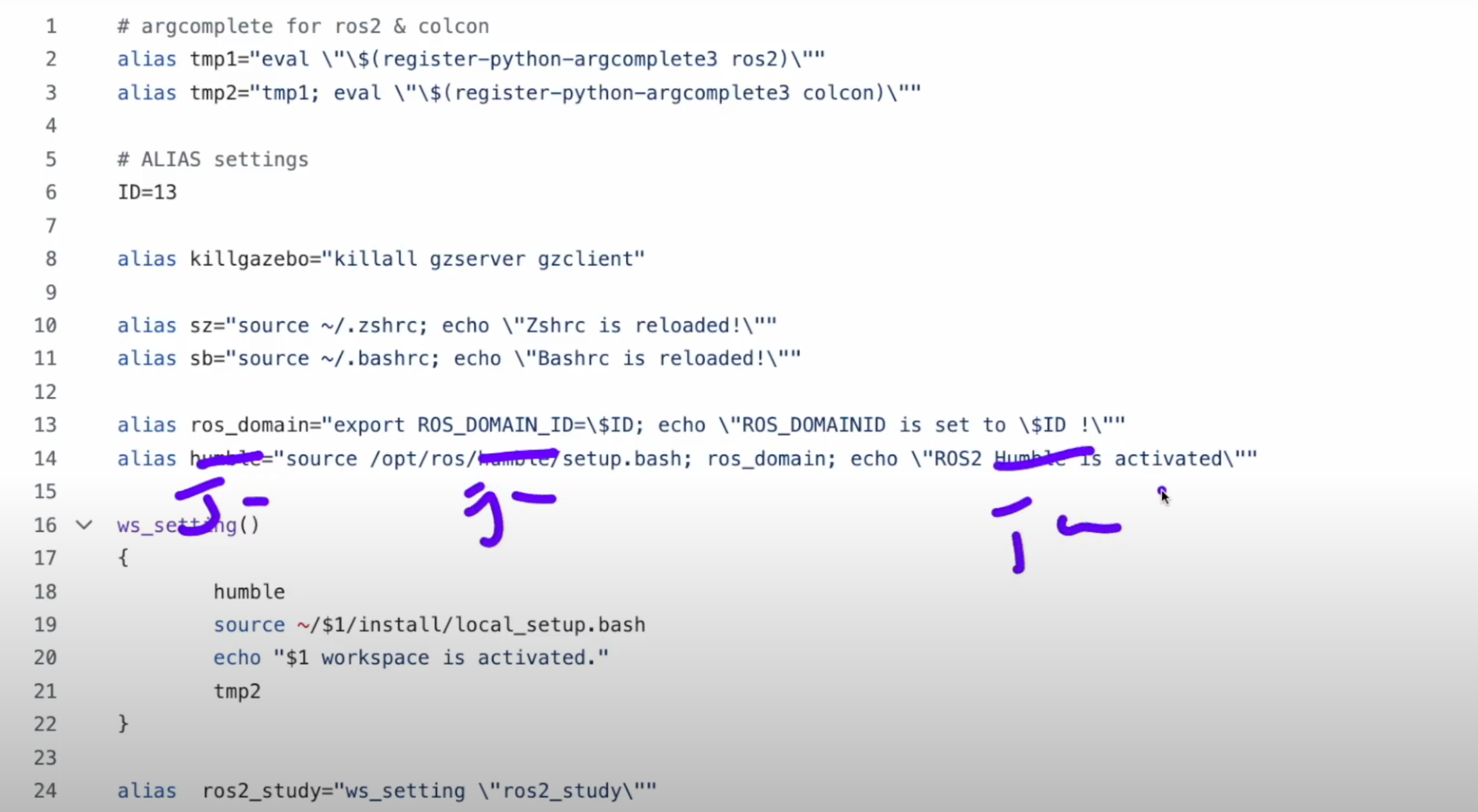 ws_setting 이라는 함수를 쓰면 humble 을 부르고, 그러고 난 다음에 소스 명령어로 여기에 함수를 사용할 때 입력 인자가 있을 거잖아요. 이걸 여기다 넣으라는 거에요. 그걸 그렇게 해서 만들고 에코로 만들어주라는 거에요.