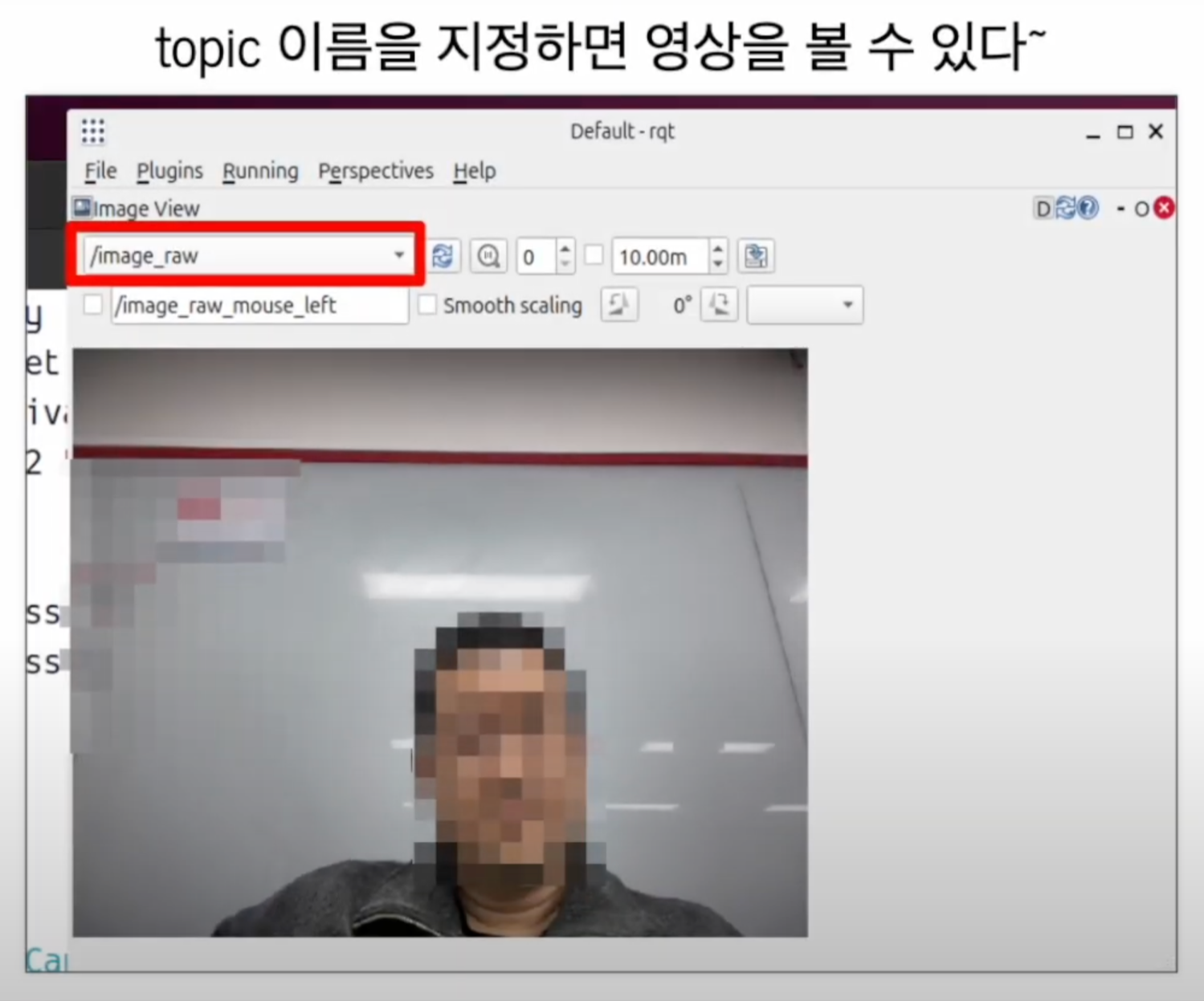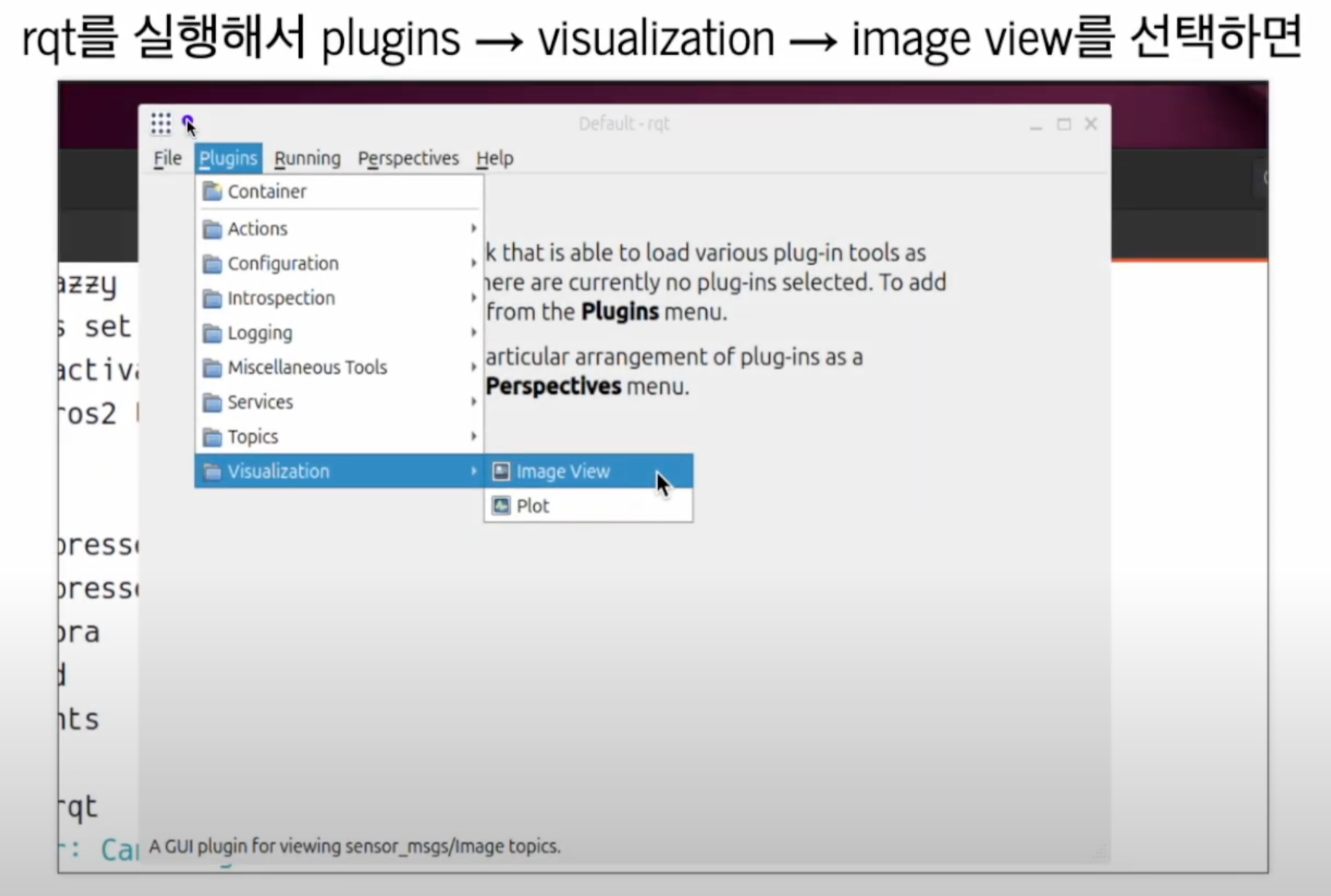 아까 rqt 해서 봤던 게 이거에요. Plugins 에서 Visualization 에서 Image View 를 선택,