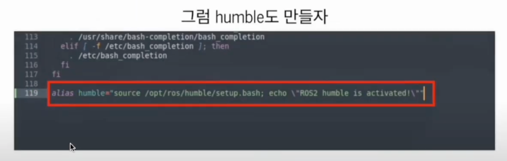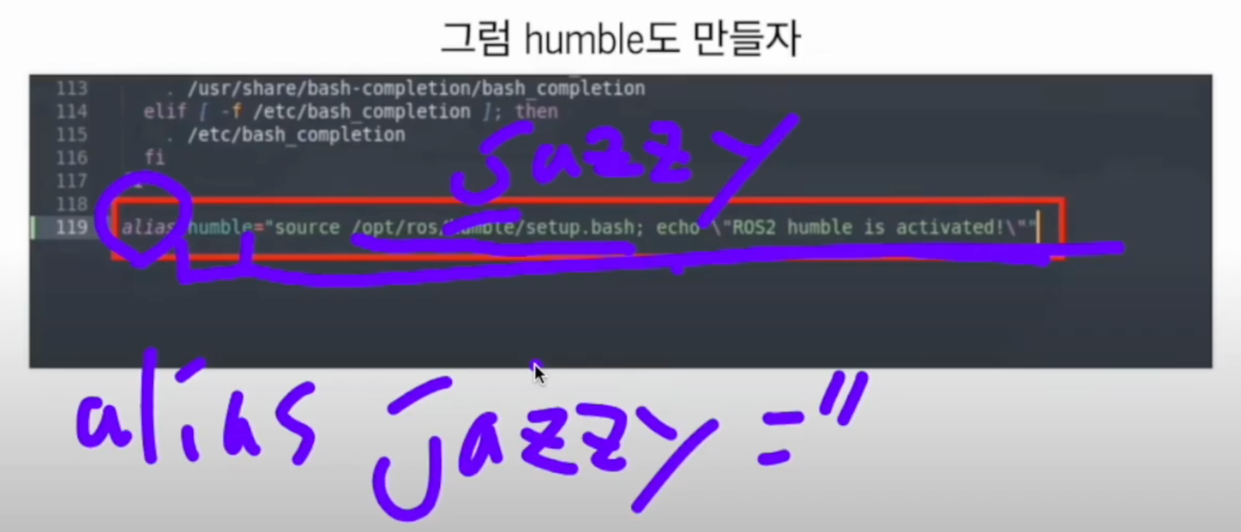 alias라는걸 만드는데, humble이라는 이름으로 opt / ros / humble 경로에 있는 setup.bash를 부르구요,