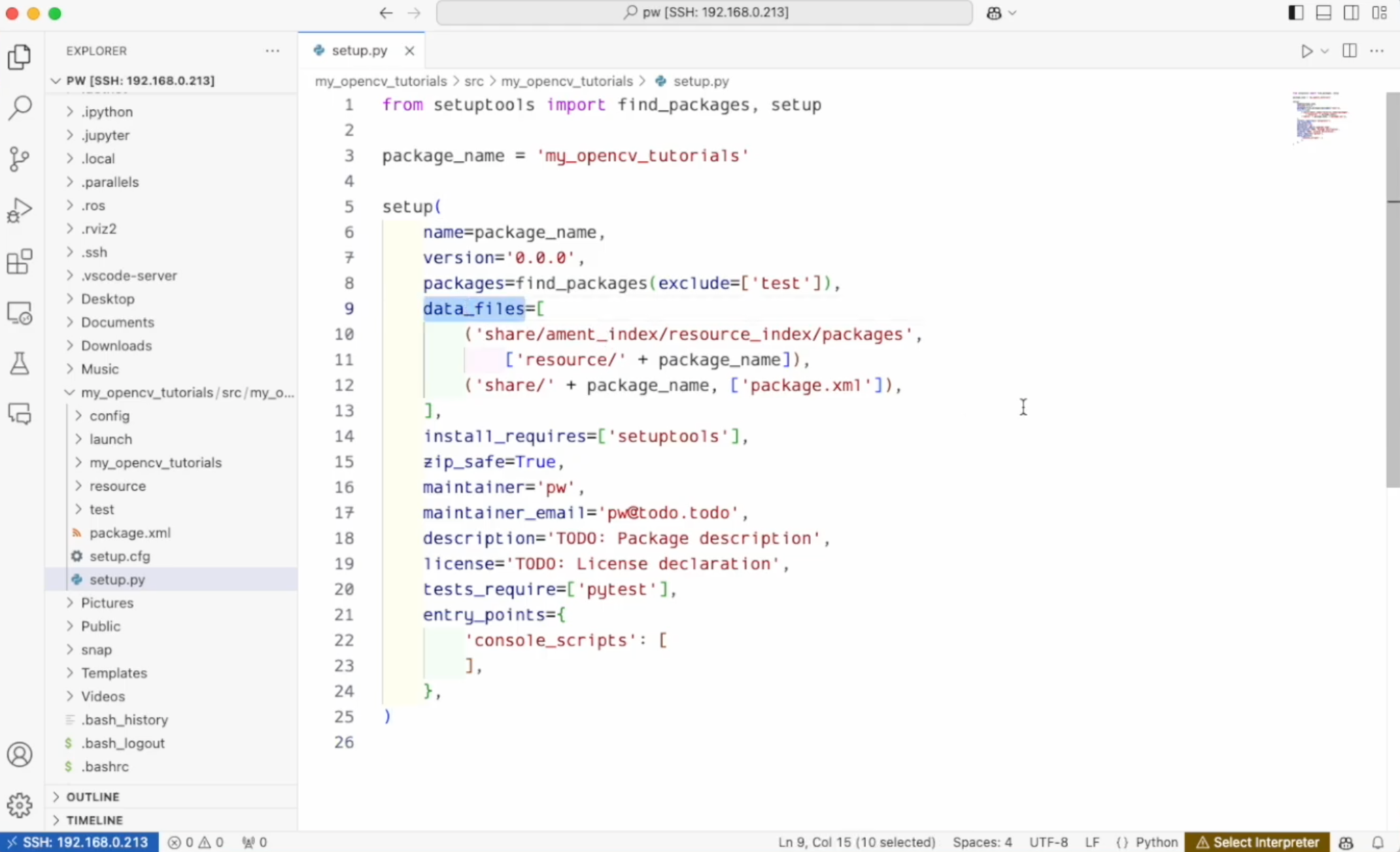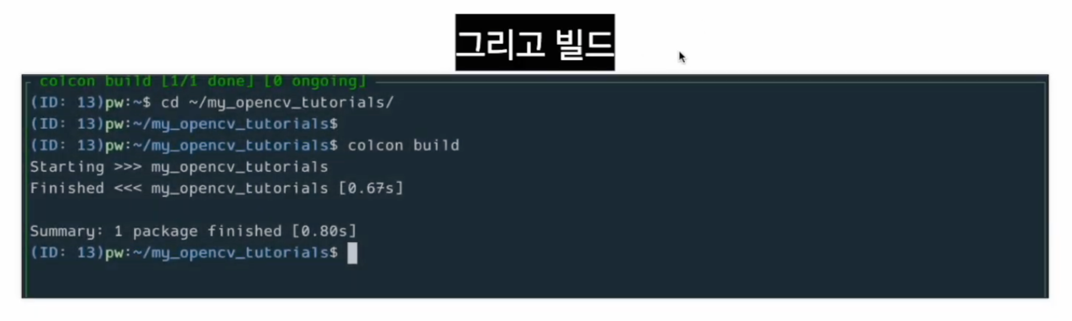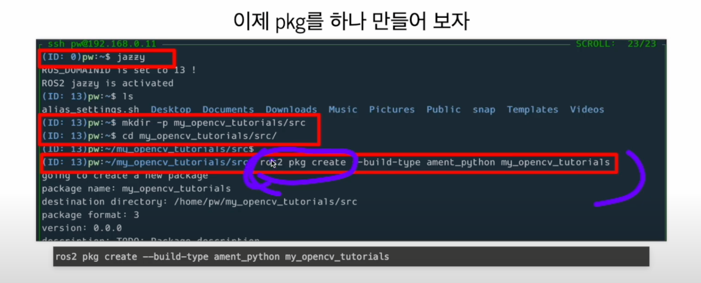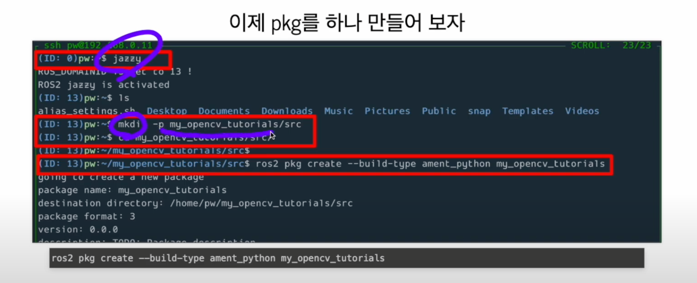 (-> ros2 pkg create / --build-type은 ament_python으로 잡았구요, / my_opencv_tutorials 라는 이름으로 만들었다는 뜻이에요.)
