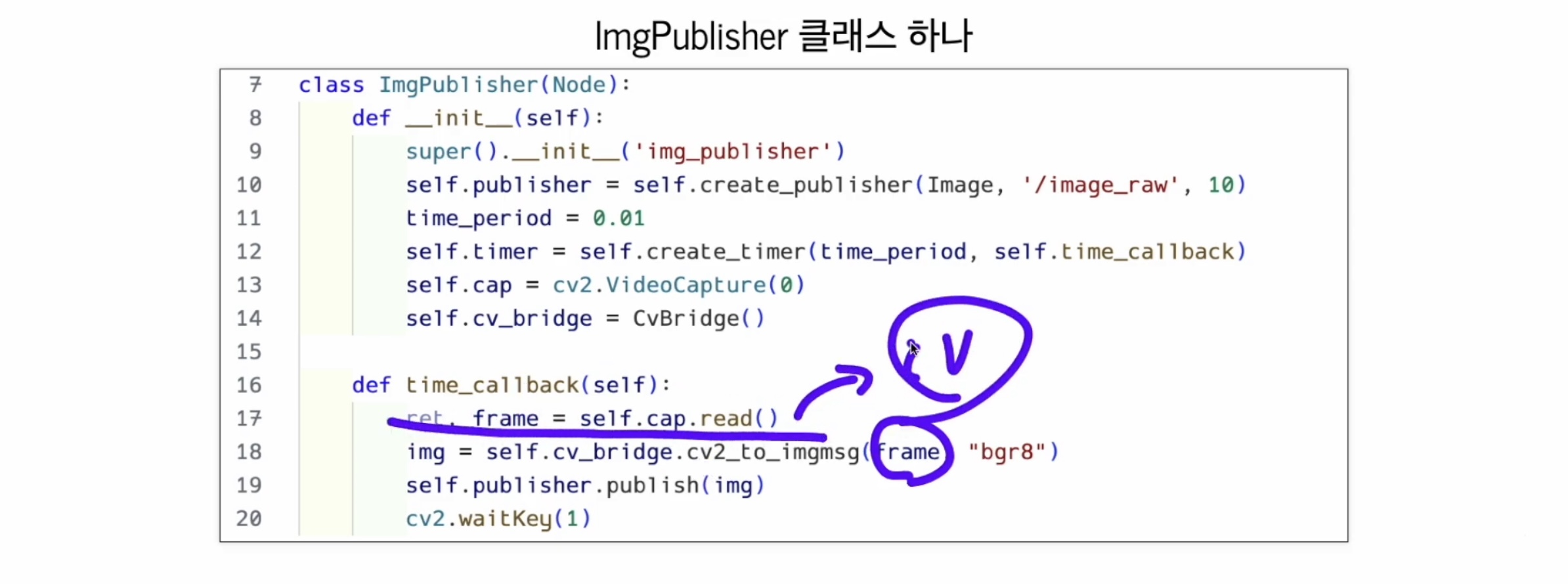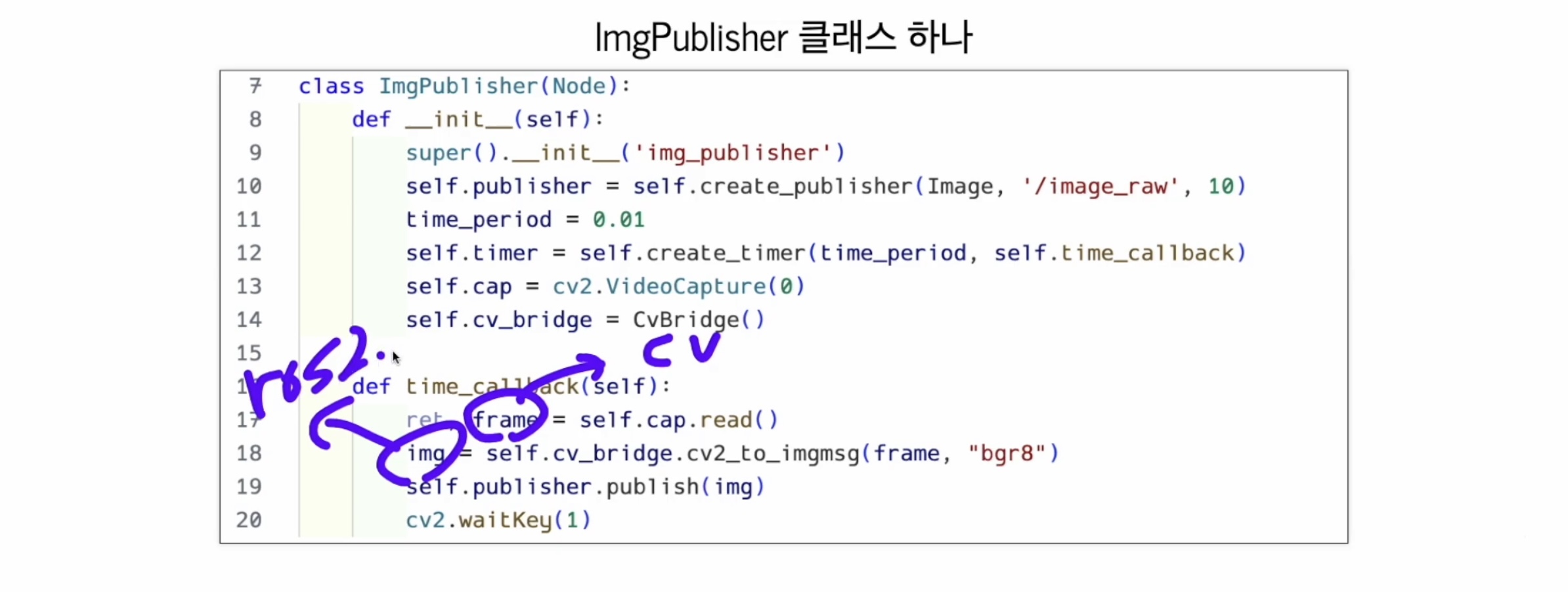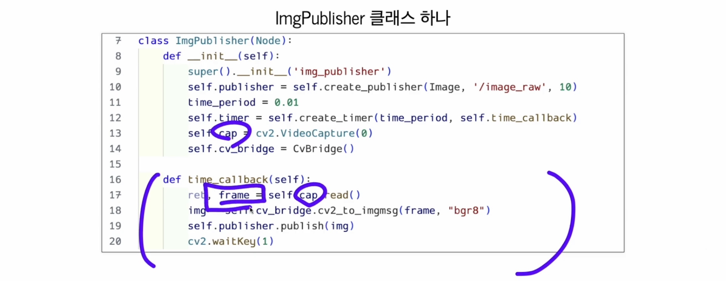 그러니까 위 동그라미 속의 frame 은 opencv 구요, 아래 동그라미 속의 img는 ros2에요.