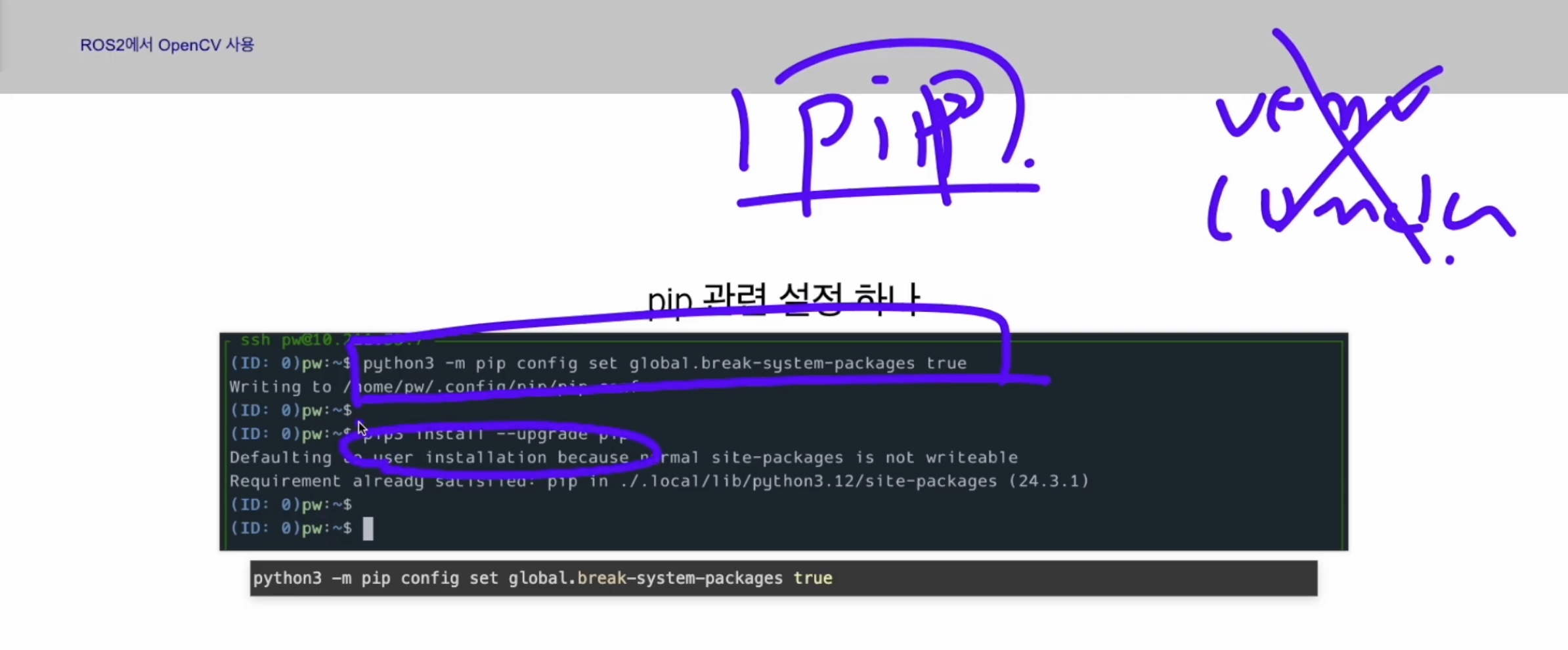pip 명령을 venv나 conda 같은 가상환경을 설정하지 않고 루트에서 바로 실행하는 경우에 에러가 난단말이죠.