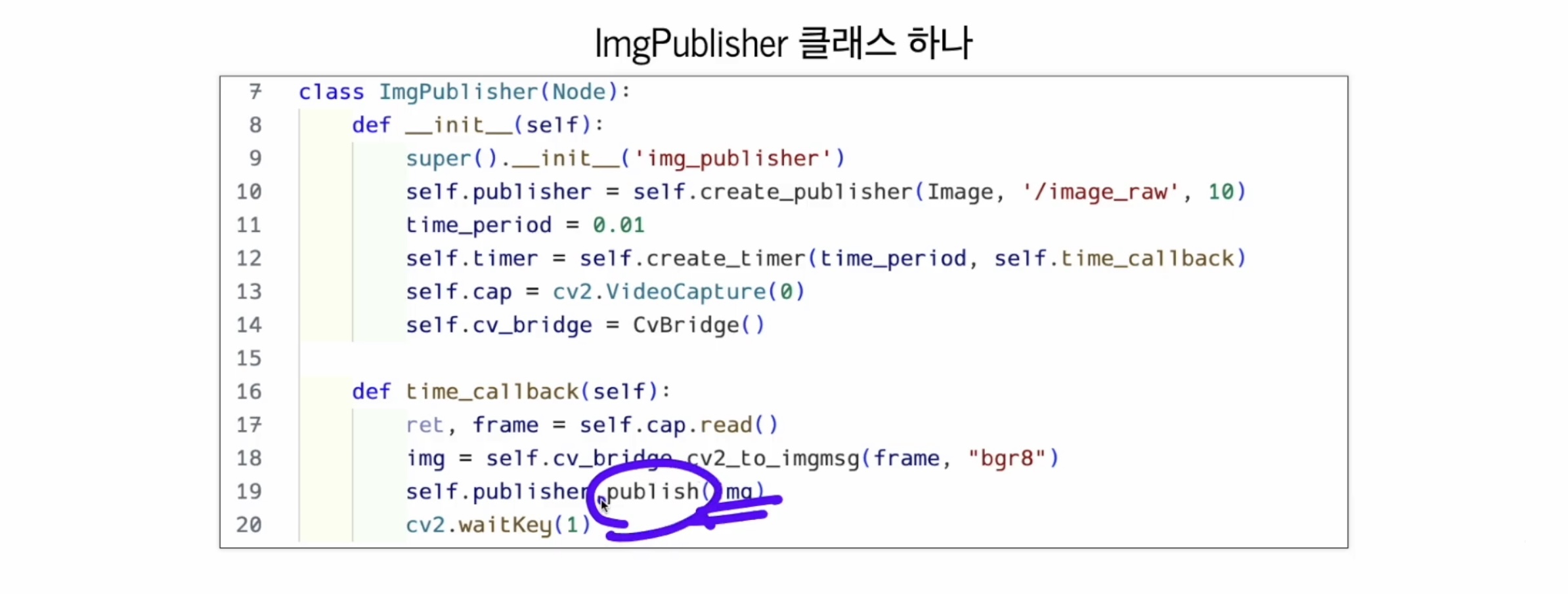 그 다음에 __init__ 안에는 img_publisher라는 이름으로 노드를 선언했어요.