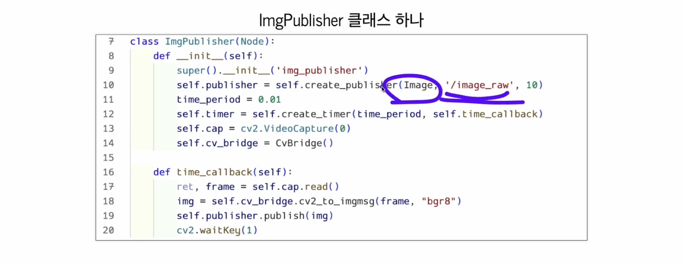 그러고 난 다음에 self.publisher한테 topic 이름을 image_raw라고 할게요.