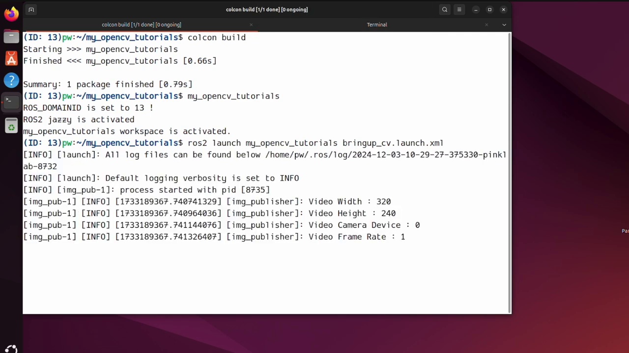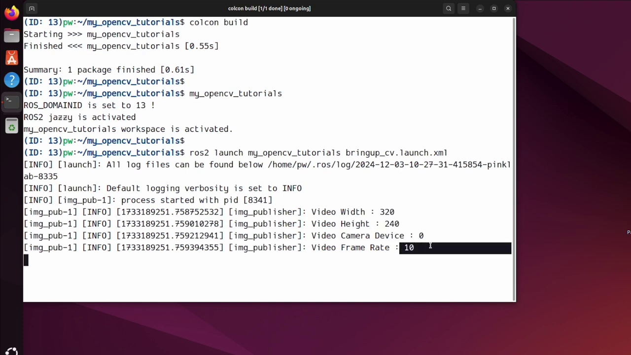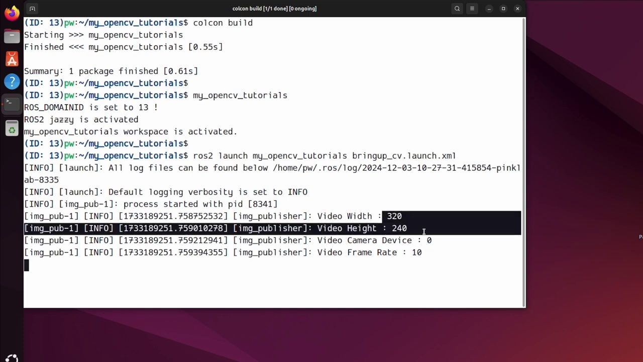 colcon build 하구요, my_opencv_tutorials 환경 부르고 ros2 launch 로 실행 해 볼게요. 초당 한 번 쏘라는 거에요.