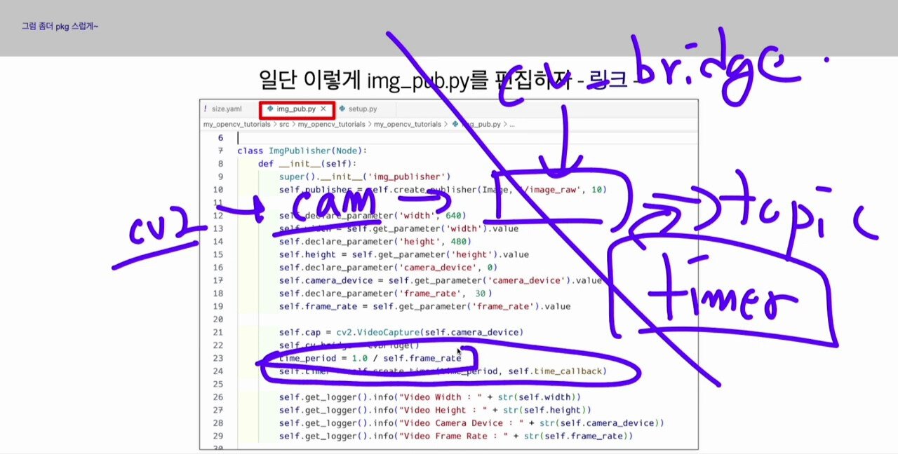 우리가 opencv에서 카메라를 열고 그 다음에 이 카메라에서 영상을 받아서 토픽으로 쏘는 작업을 하고 있어요.