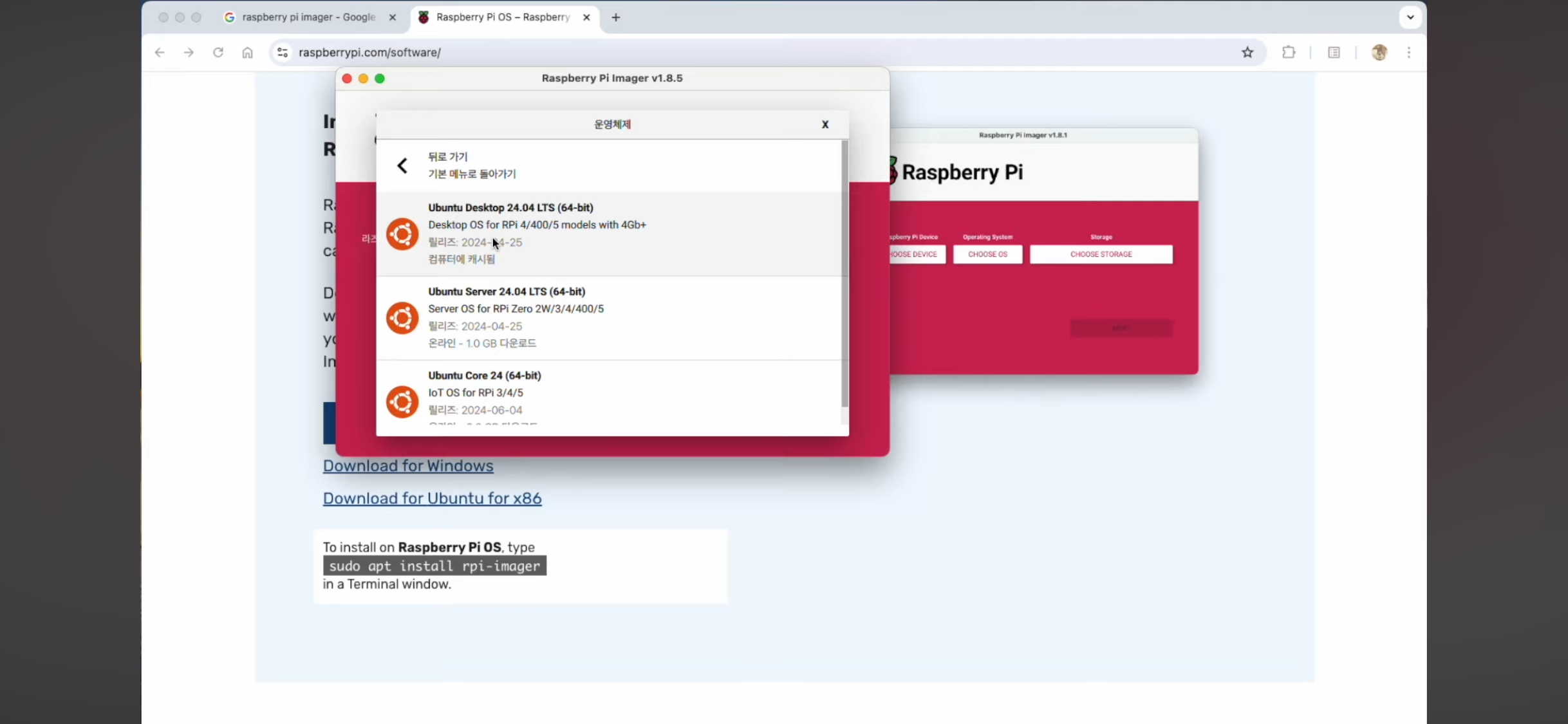 현재까지 해서 Rasberrypi 5 에 Ubuntu Desktop 24.04예요. 24.04 선택했구요,