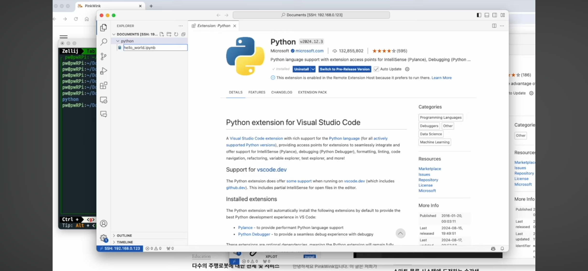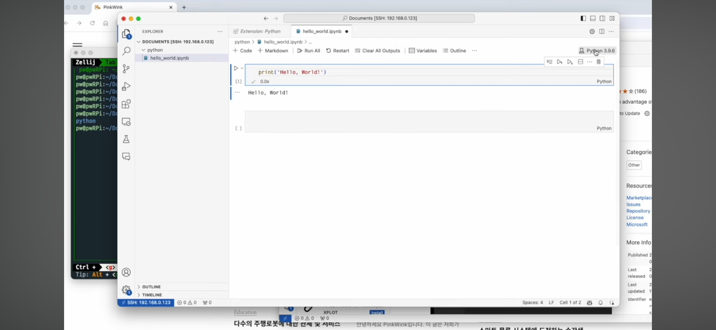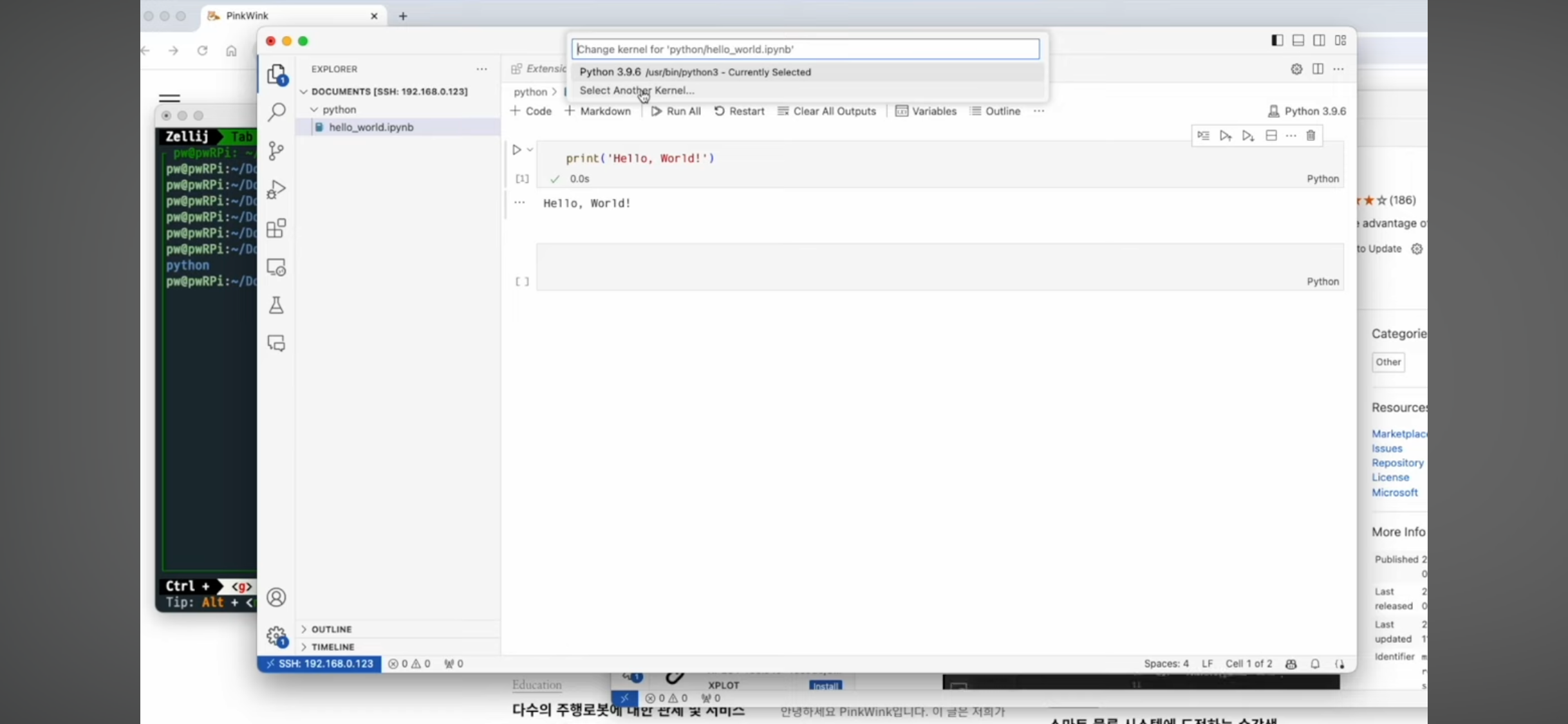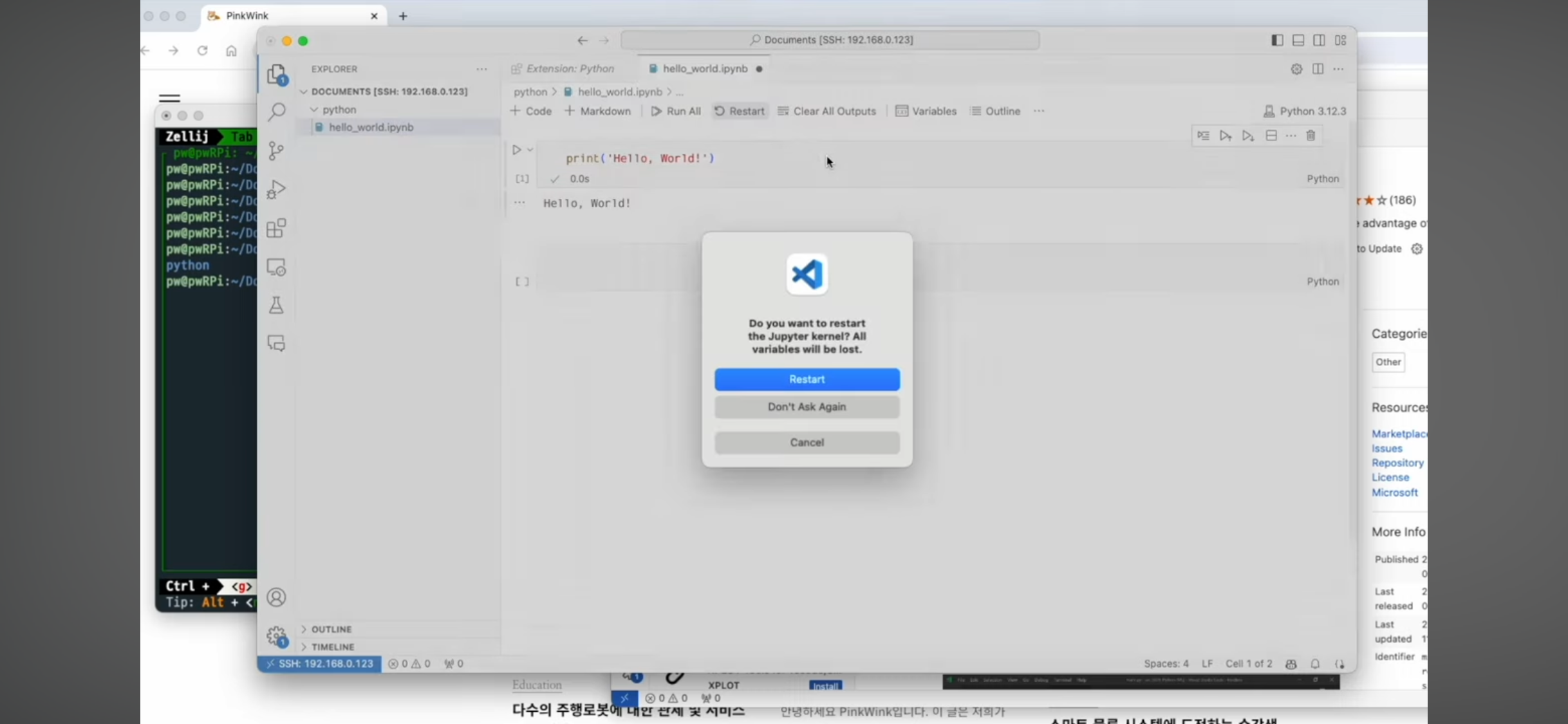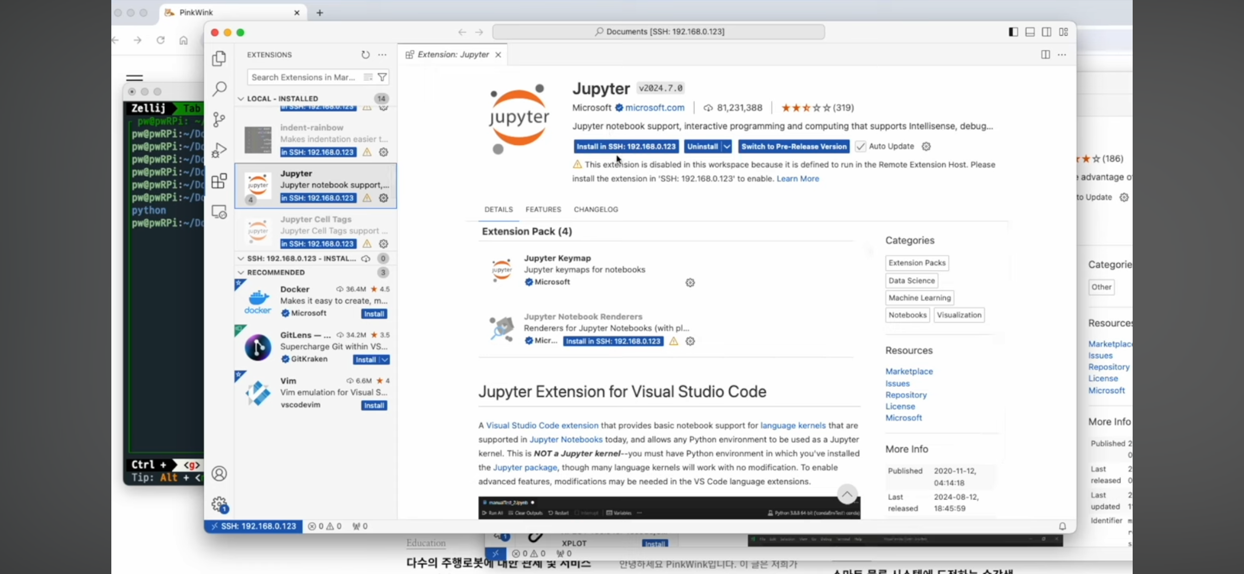 이 jupyter를 ssh로 이 문구가나와야돼요. 주피터를 지금 익스텐션에 들어가서 이게 나와야해요. 아, ssh에 이 경로에다가 jupyter를 설치한다, 라는 이 문구가 나와야해요. 그러면 ssh에서 쓸 수 있도록 jupyter를 설치하게 된답니다. 그러면 jupyter는 설치가 잘 되었구요,