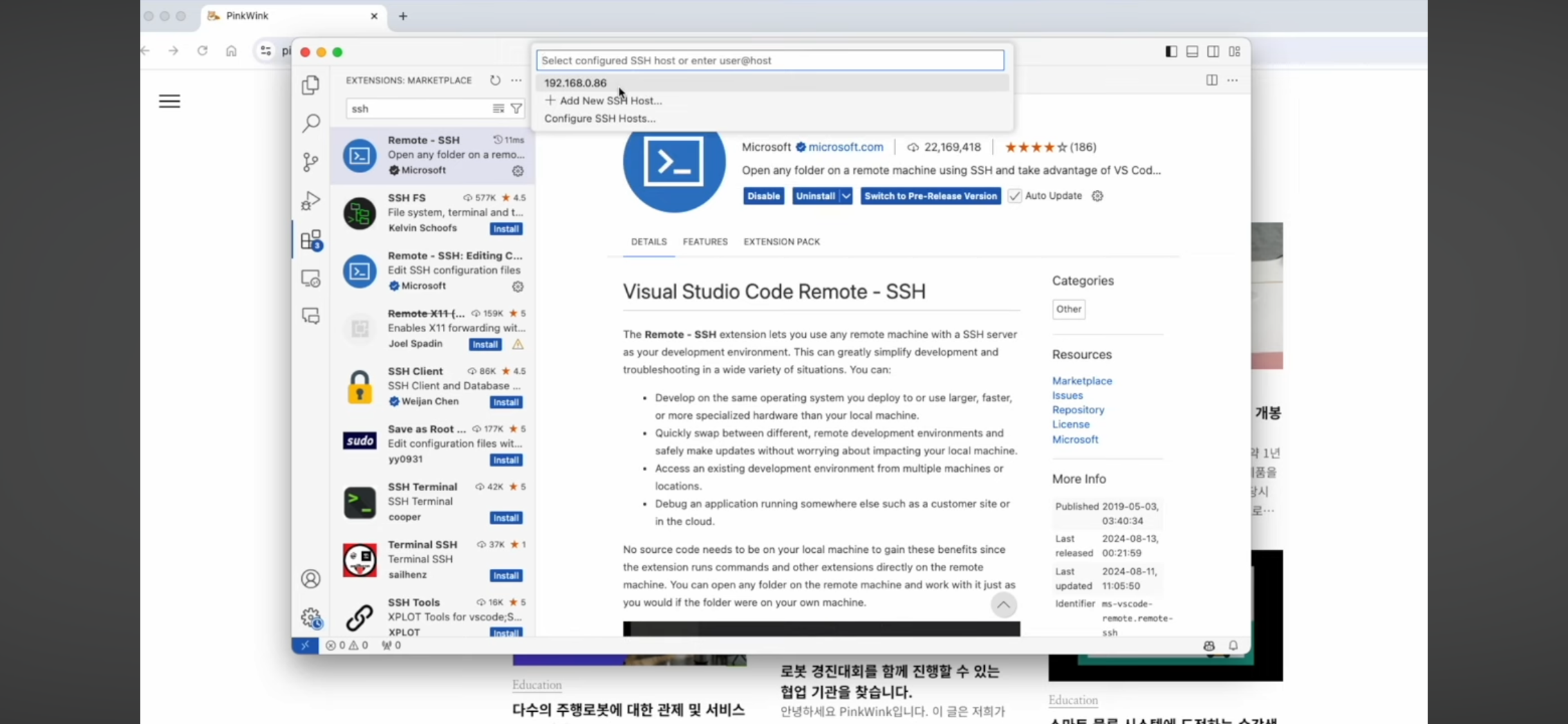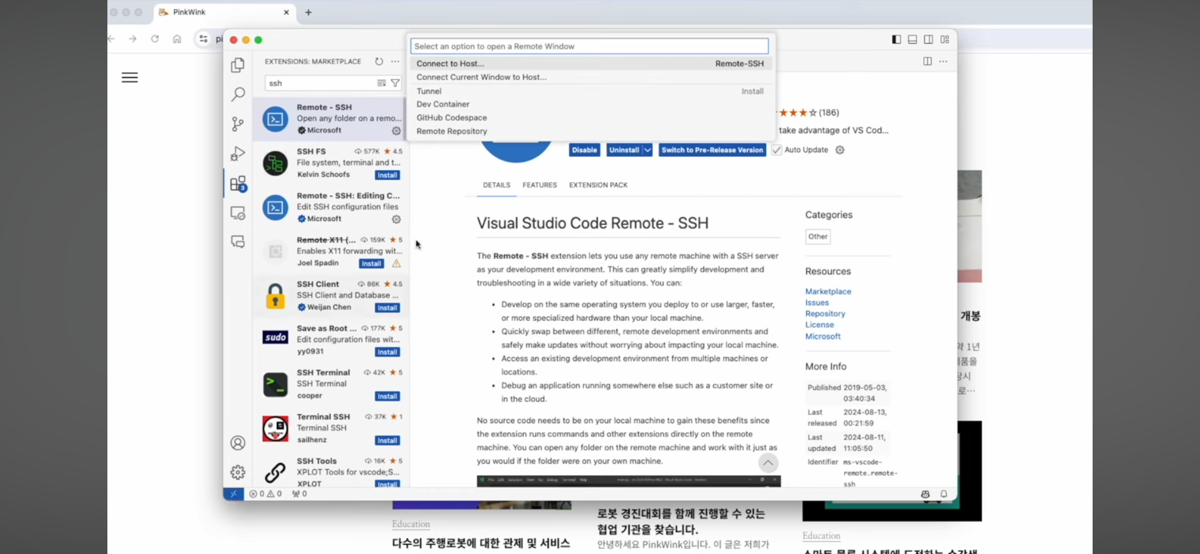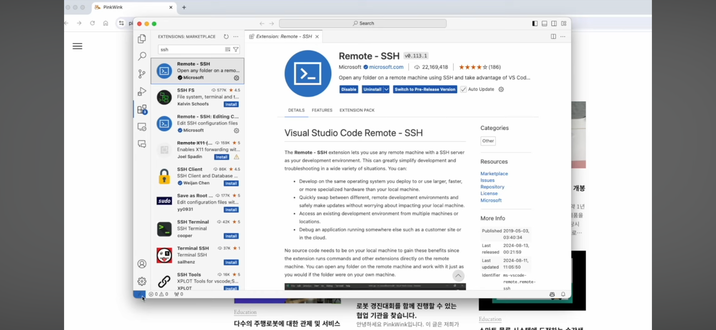 이건 뭐냐면 extension에 들어가서 ssh를 검색해서 remote ssh , 강사님께서는 이미 설치되어 있으신..! 이걸 설치하면 된답니다. Remote ssh 를 설치하시고 나면