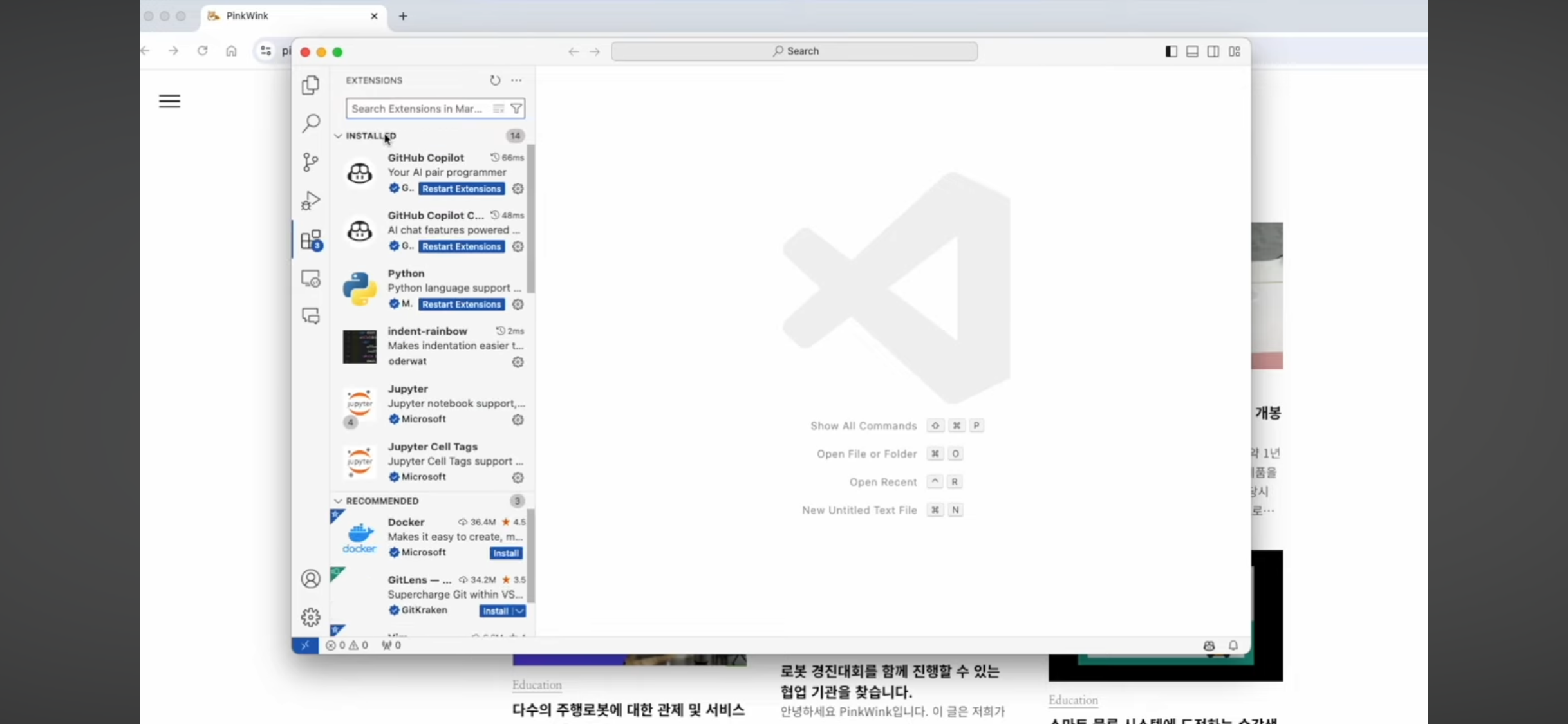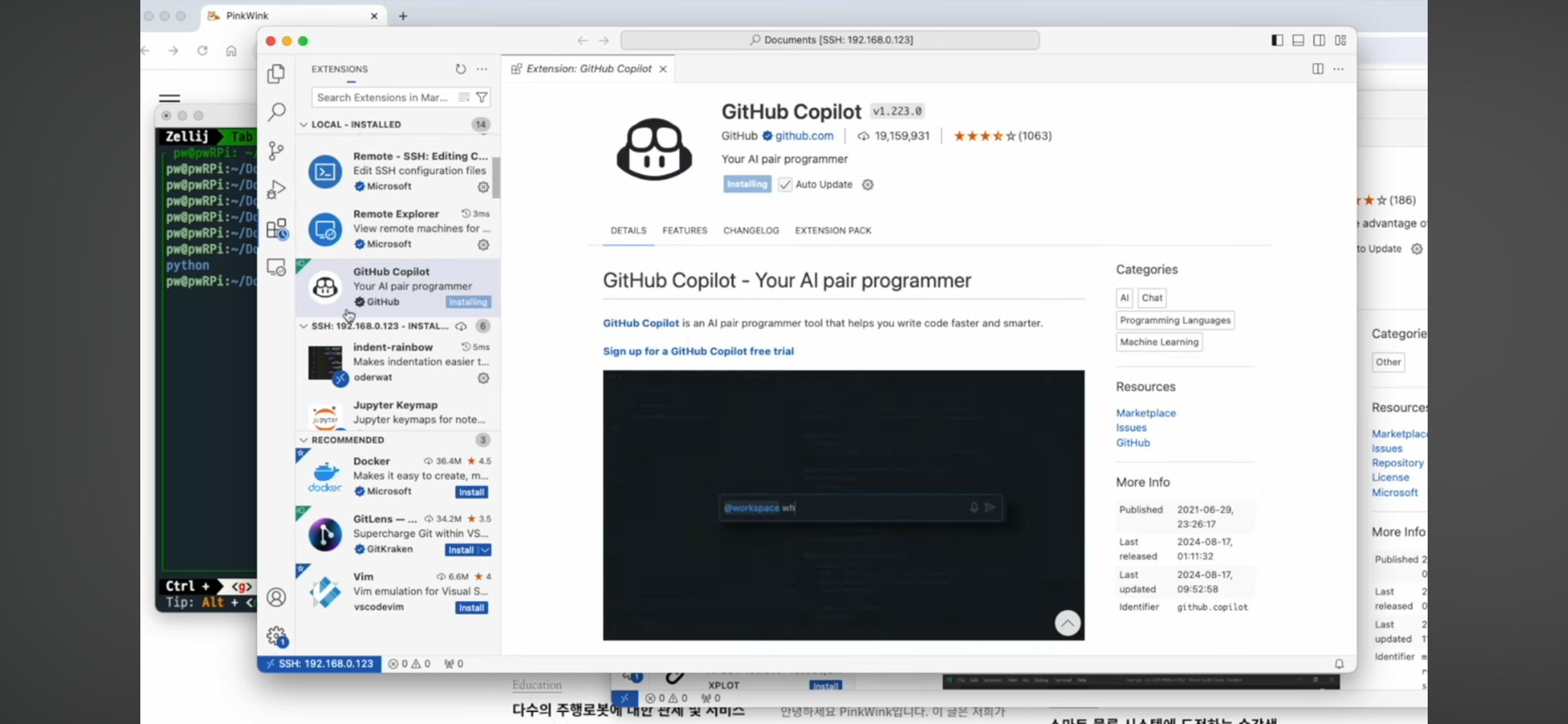 강사님께서는 copilot 좋아한다 하셔요. 코파일럿도 그냥 일단 설치를 했구요, 강사님께서 설치했던 local pc에 설치 할 수 있었던 vs code extension은 다 설치가 가능해요. 잘 됐어요.