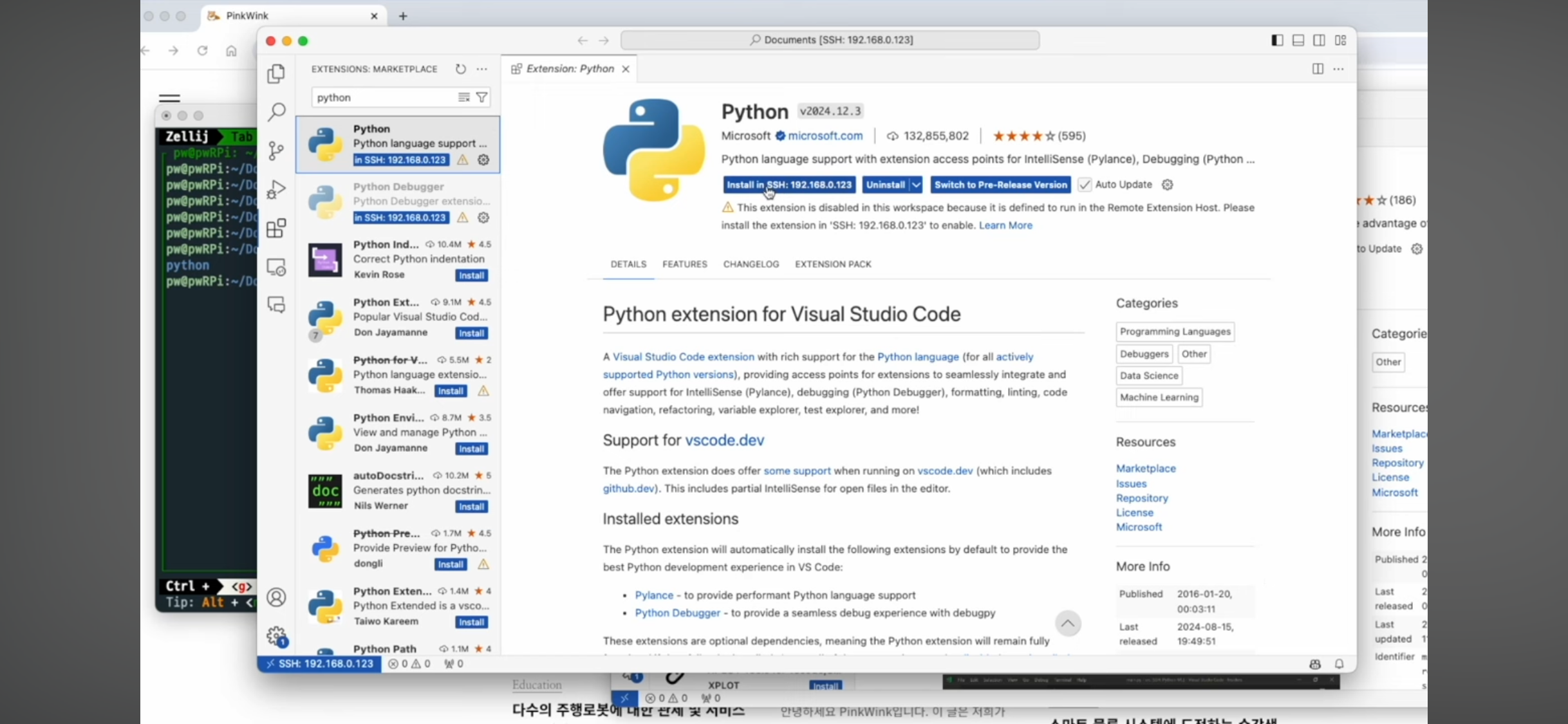그 다음에 python 이것도 python ssh에 설치를 해 주어야해요. 이 파이썬은 jupyter notebook 하고.. 다 우르르 설치하는 아이예요.
