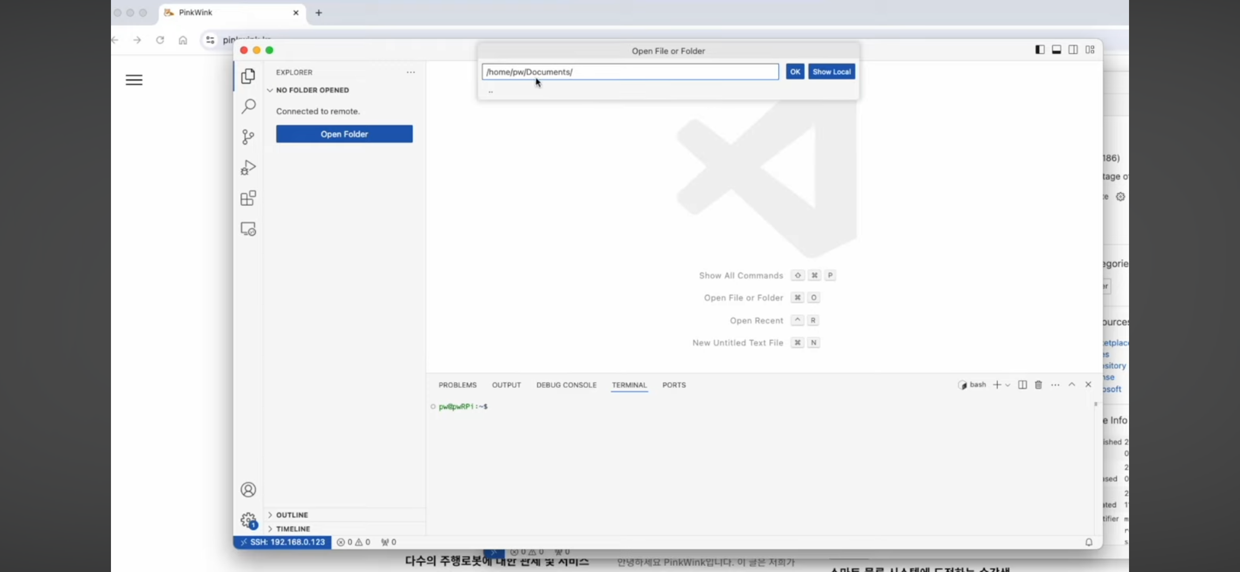 오픈 폴더 뜨죠, 터미널상에서 접속이 완료 되었구요, 오픈 폴더 누르구요,