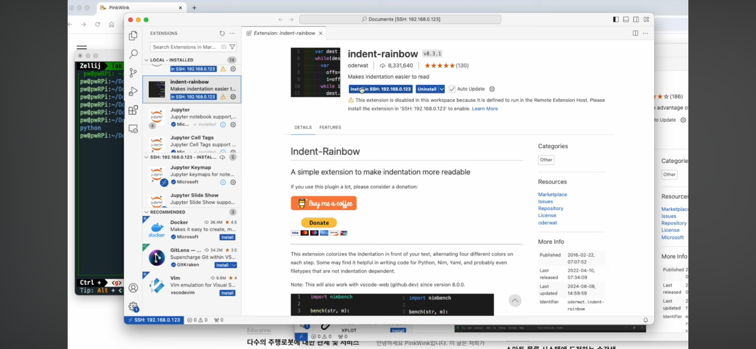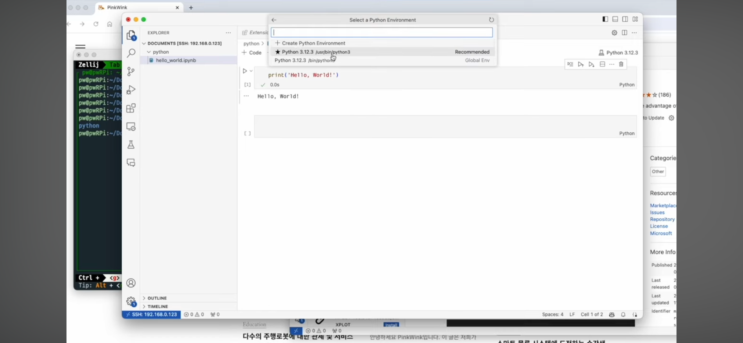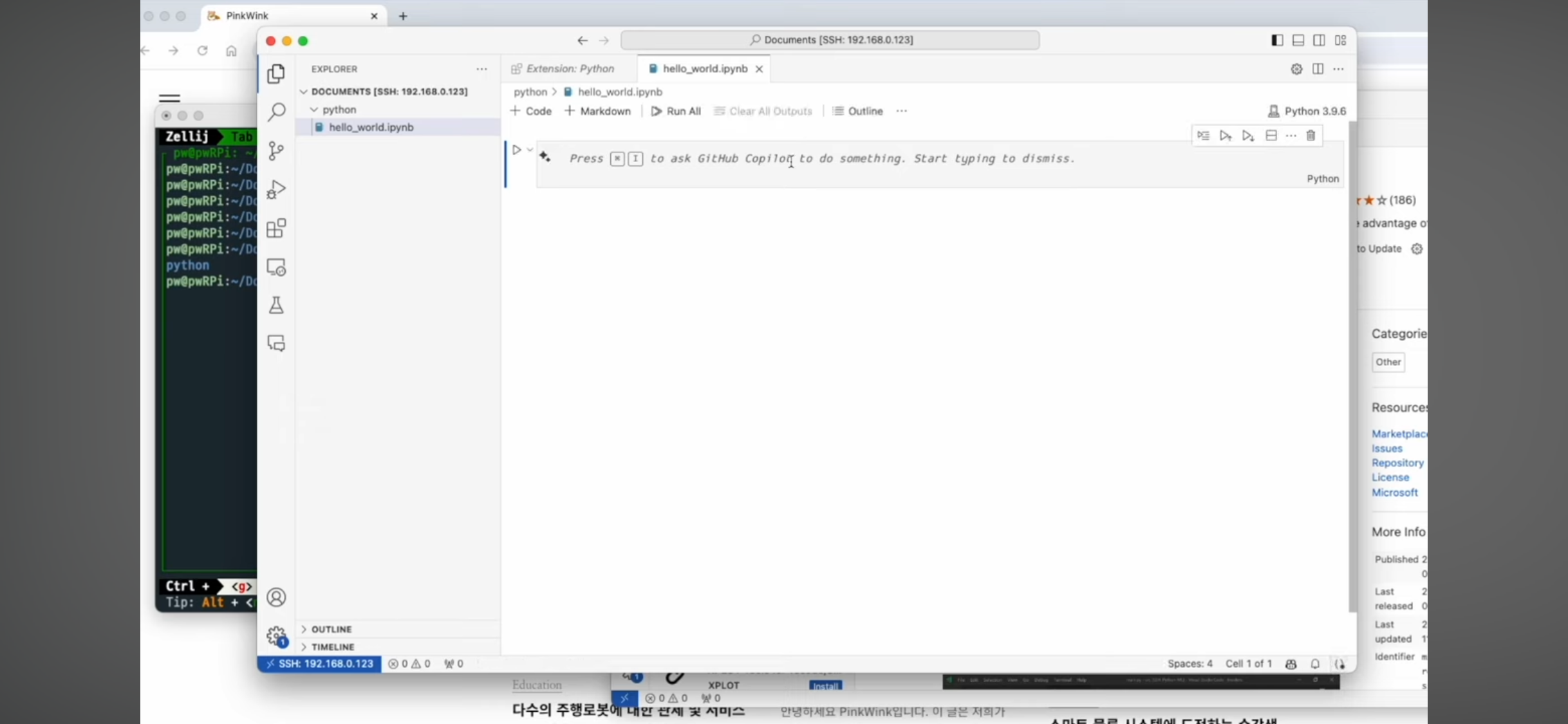 이 jupyter를 ssh로 이 문구가나와야돼요. 주피터를 지금 익스텐션에 들어가서 이게 나와야해요. 아, ssh에 이 경로에다가 jupyter를 설치한다, 라는 이 문구가 나와야해요. 그러면 ssh에서 쓸 수 있도록 jupyter를 설치하게 된답니다. 그러면 jupyter는 설치가 잘 되었구요,