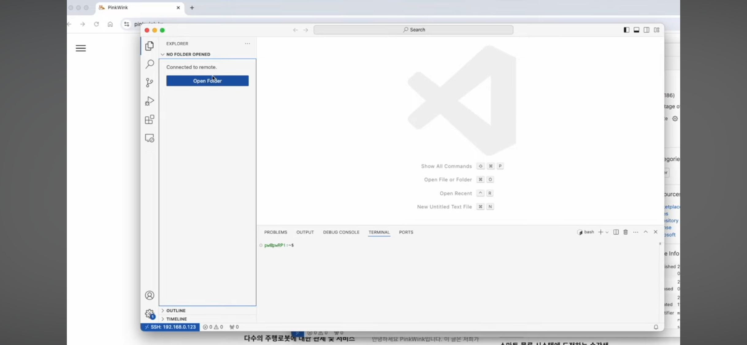 오픈 폴더 뜨죠, 터미널상에서 접속이 완료 되었구요, 오픈 폴더 누르구요,