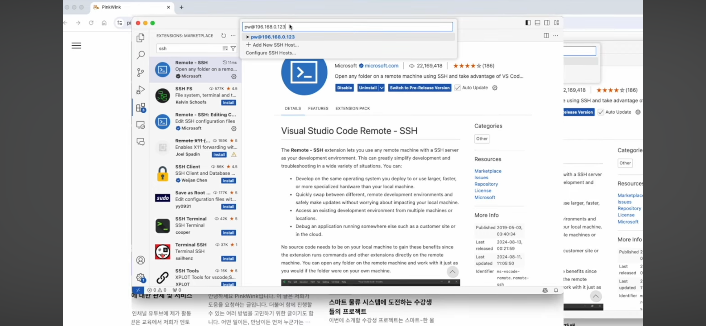 이건 뭐냐면 extension에 들어가서 ssh를 검색해서 remote ssh , 강사님께서는 이미 설치되어 있으신..! 이걸 설치하면 된답니다. Remote ssh 를 설치하시고 나면