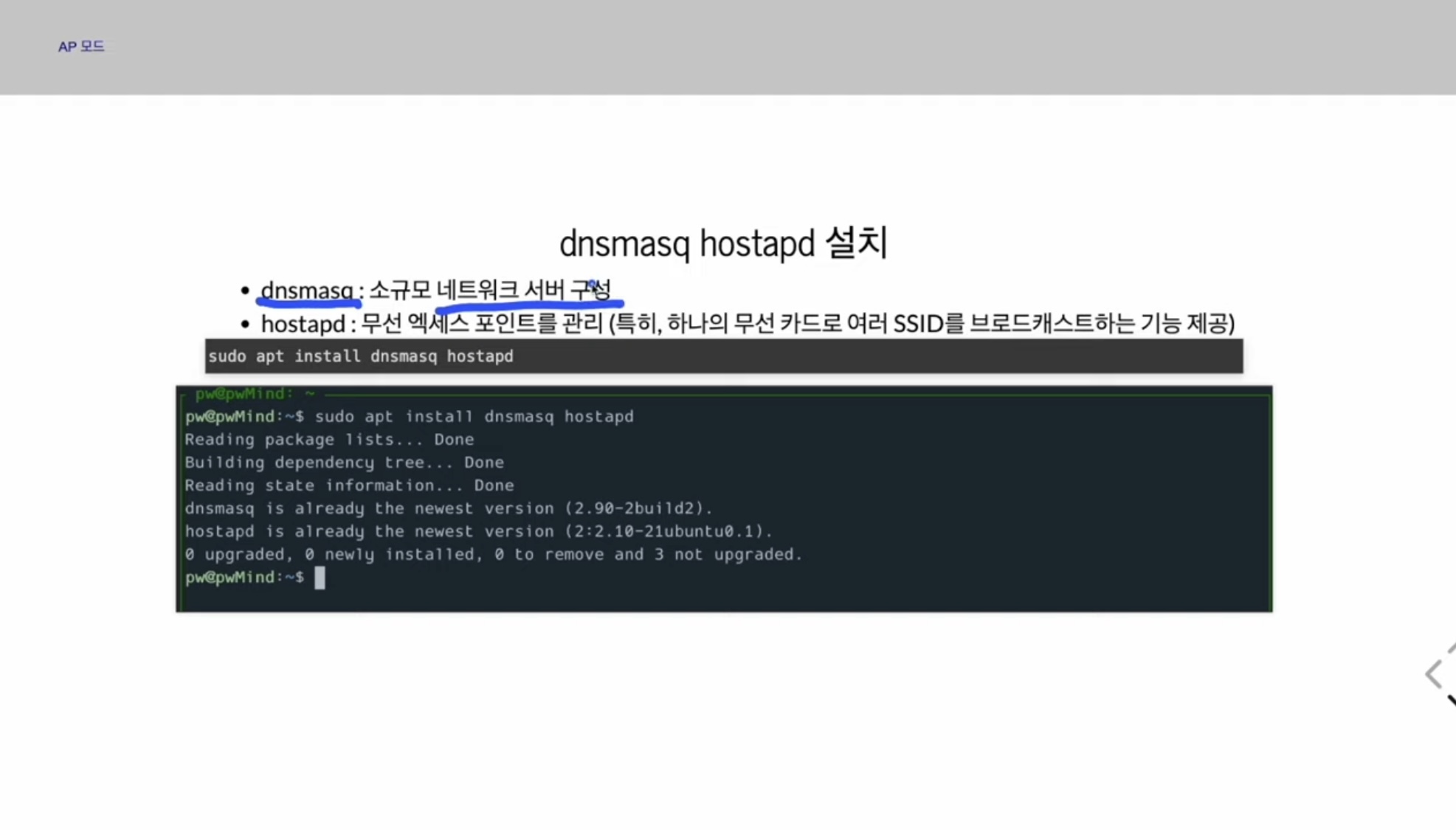 sudo apt install dnsmasq 이거랑, hostapd두 개를 설치해라 라고 시킨 거예요.