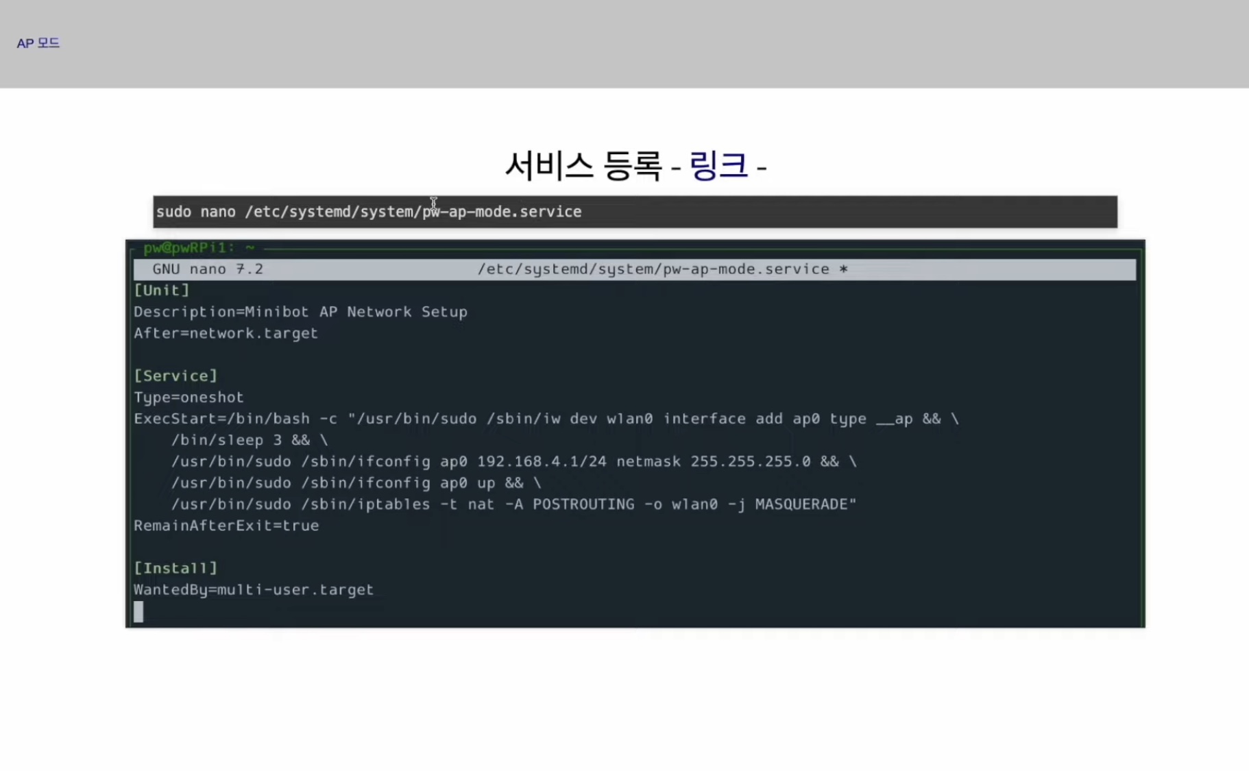 먼저 sudo nano /etc/system/pw-ap-mode.service, 서비스 하나 만들어서 부팅 할 때 움직이도록 할 거예요.