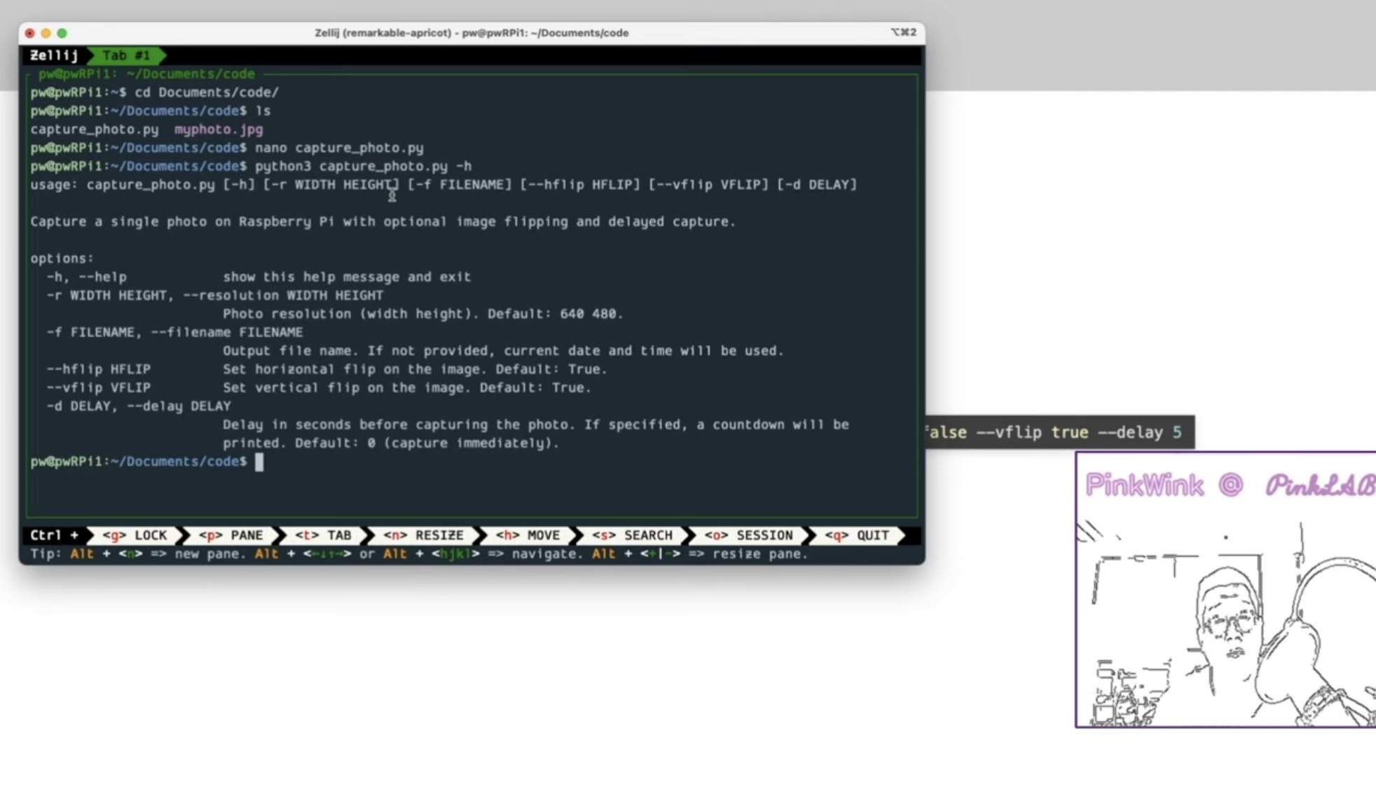 python 혹은 python3, 캡처 포토 파이, resolution 지정할거면 --resolution 800 600 이렇게, filename 지정할거면 --filename test_photo.jpg 이렇게, 상하좌우 반전 할 거면 --hflip true, --vflip true, 이렇게 둘 다 트루 해 줘야해요, delay 줄거면 --delay 5