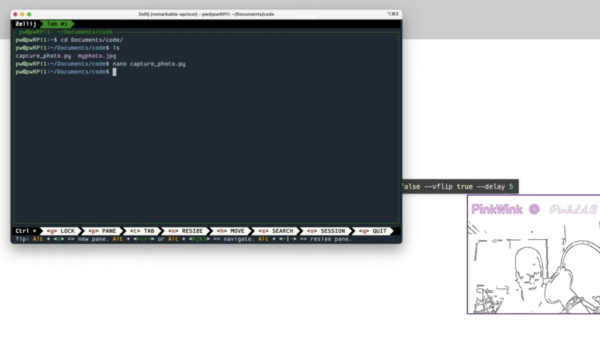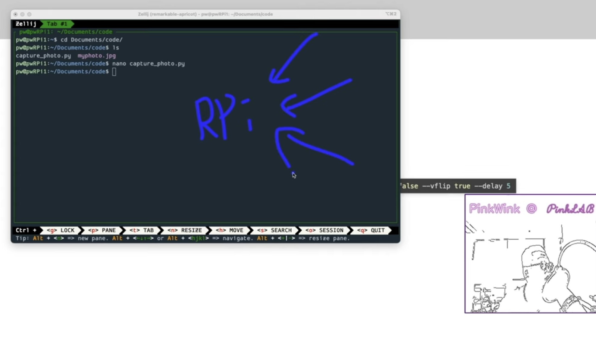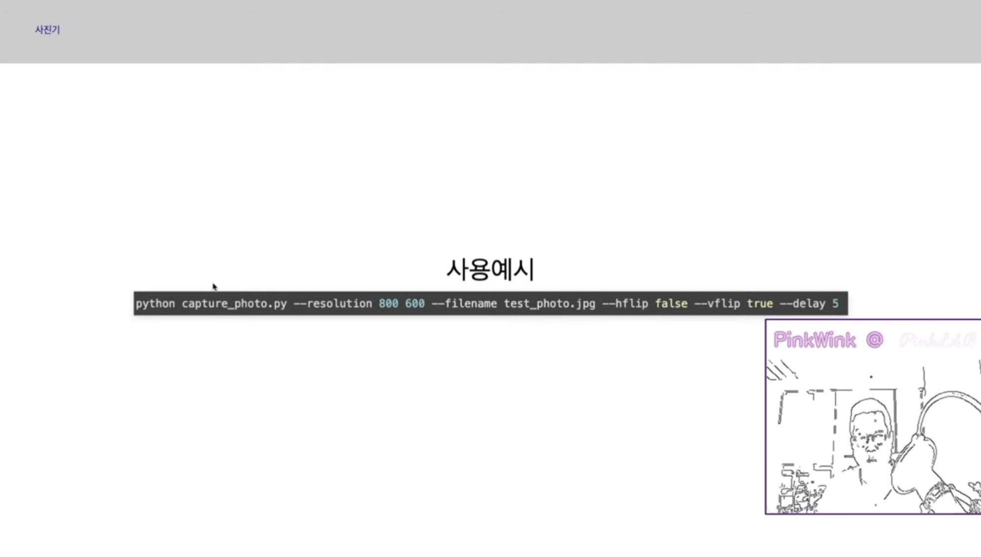 python 혹은 python3, 캡처 포토 파이, resolution 지정할거면 --resolution 800 600 이렇게, filename 지정할거면 --filename test_photo.jpg 이렇게, 상하좌우 반전 할 거면 --hflip true, --vflip true, 이렇게 둘 다 트루 해 줘야해요, delay 줄거면 --delay 5