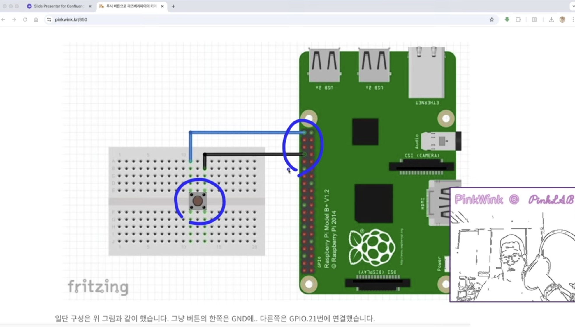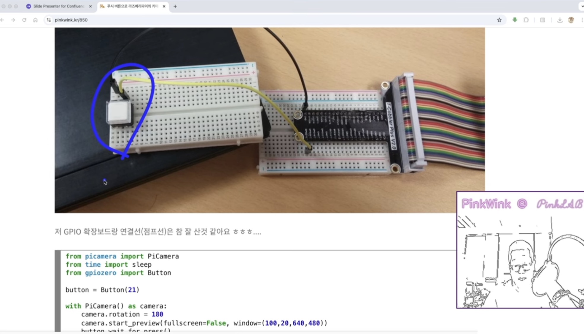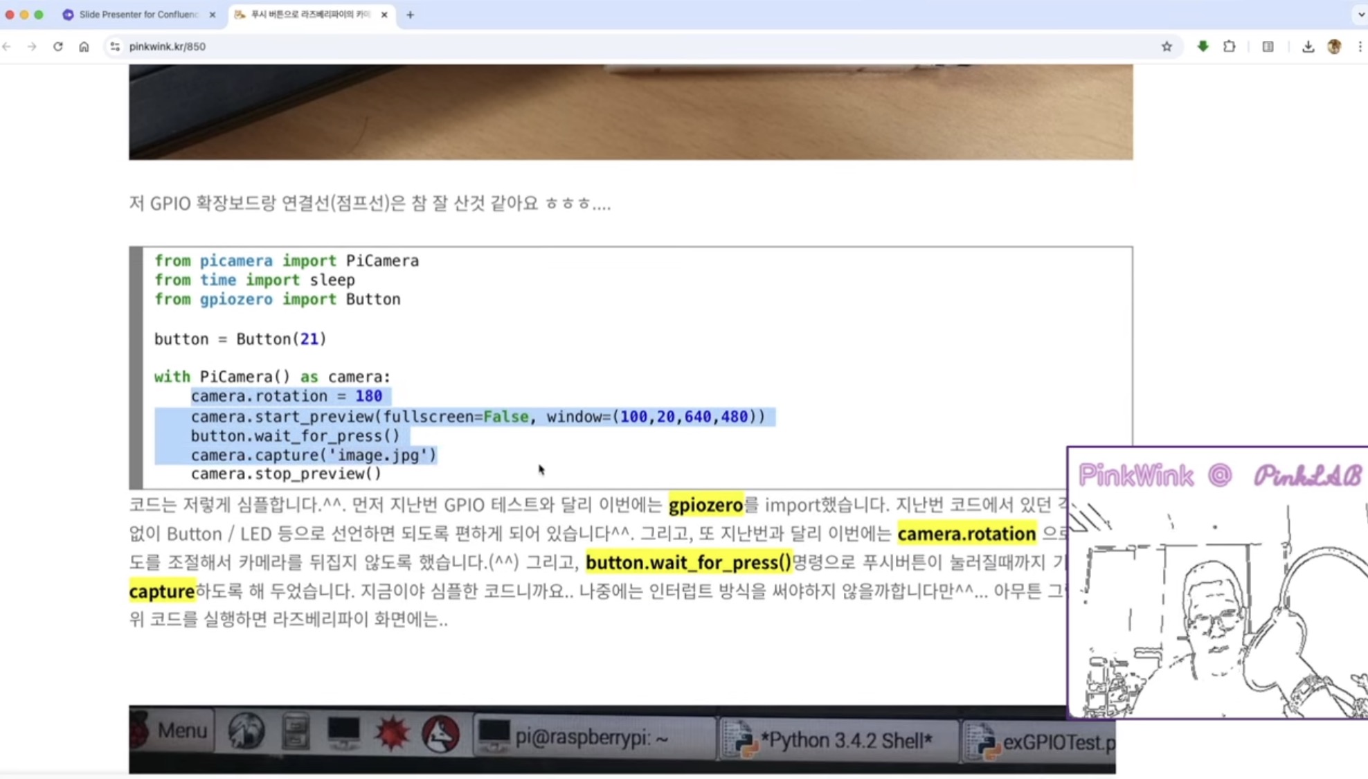 이렇게 라즈베리 파이 보드에 버튼을 하나 달아서 (GPIO 에다 버튼 하나 달아서) 이걸 꾹 하고 누르시면 사진이 띡 하고 찍히고 했던거죠.